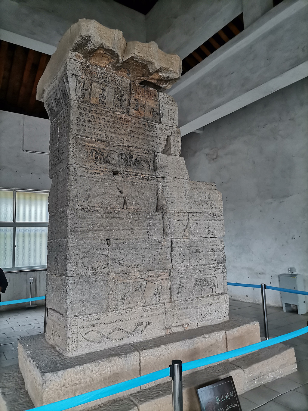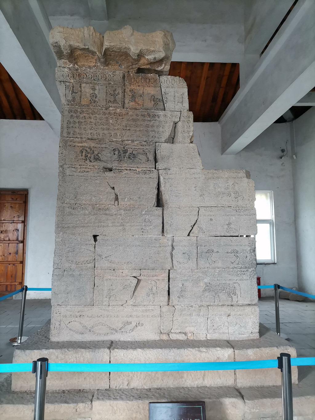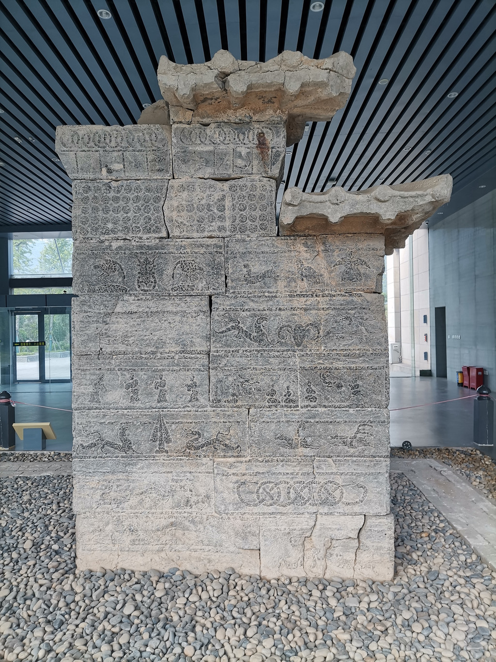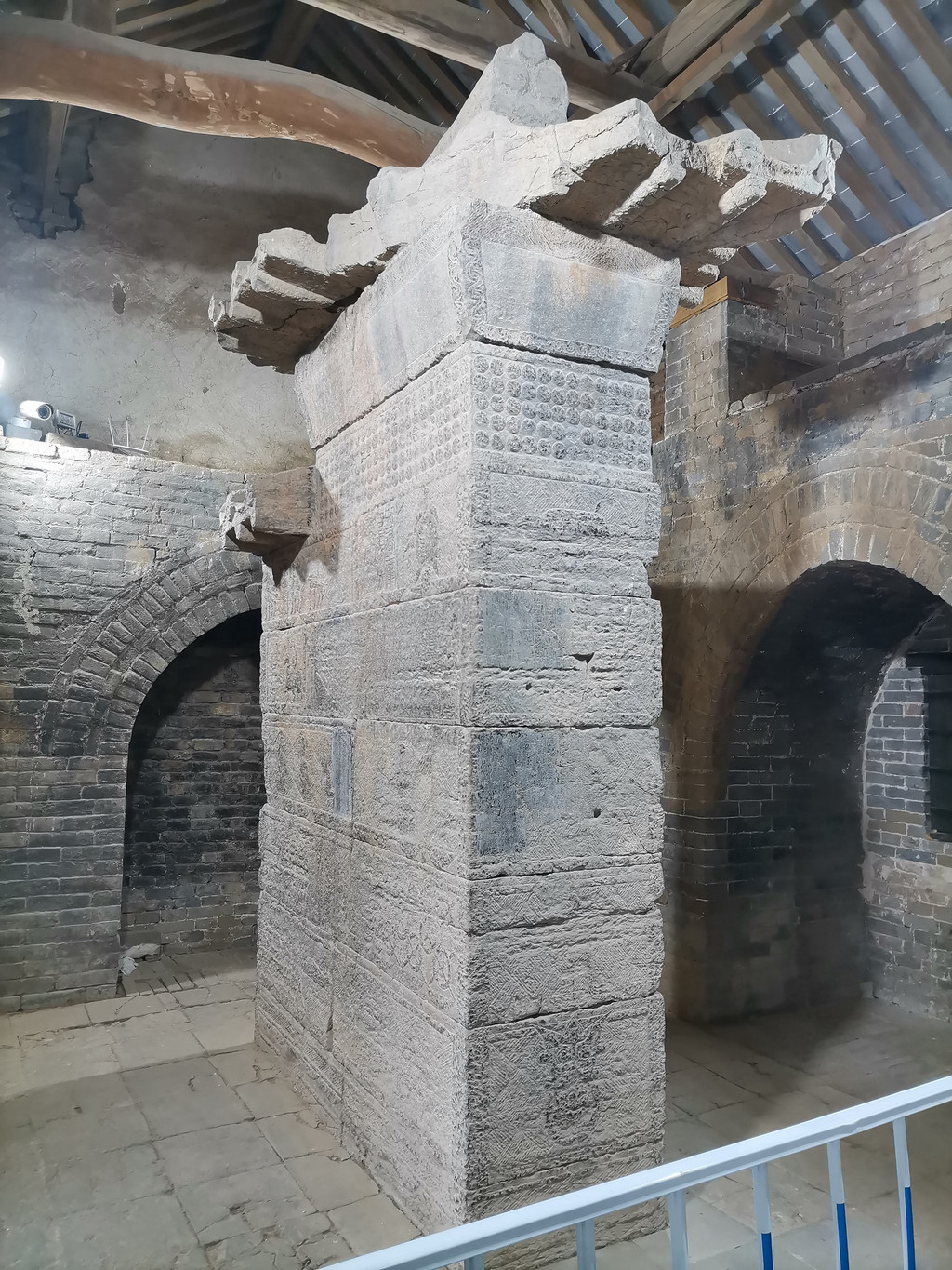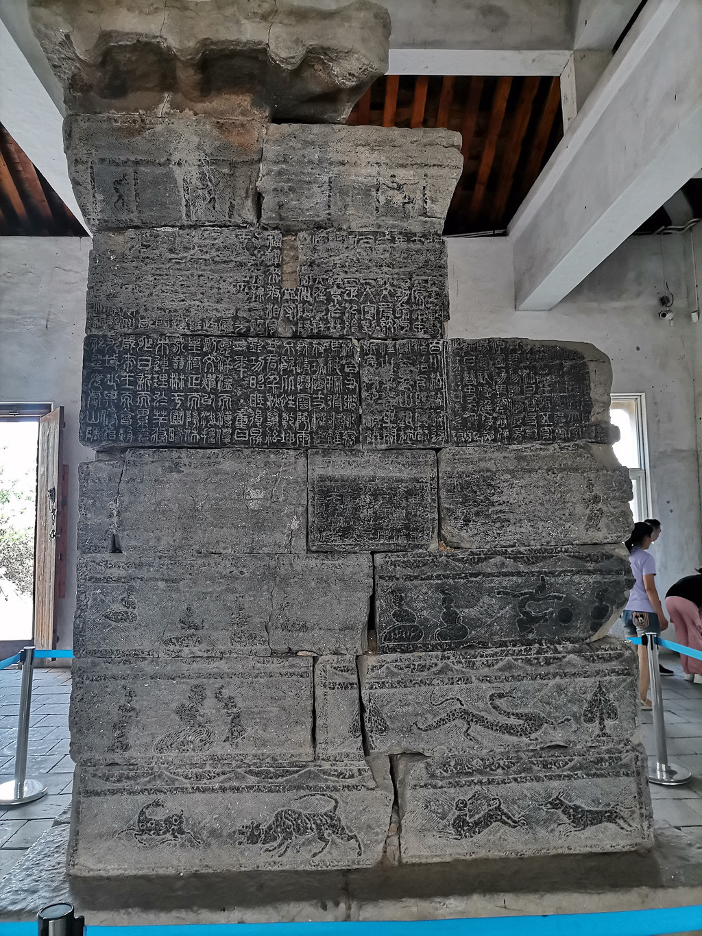 作为国家首批重点文保单位当中的002号古建筑,它建于东汉安帝延光二年,公元123年,属子母阙,阙体高约四米,两阙间隔近七米,用方正的石灰石叠筑而成。阙体表面的文字,因年代久远,所余不多,却是中岳汉三阙中图案最为清晰的一处。剩余的60余幅刻象中,有驯兽图,蹴踘图,拜谒图,狩猎图,青龙自虎图,交龙车马出行图,鹭鸟食鱼图,斗鸡图,比翼鸟,奔鹿图等,图案多用减地平雕的手法,线条精炼,兼具写实与写意之美,典型的反映了秦汉时代石刻造像的雄劲大气。