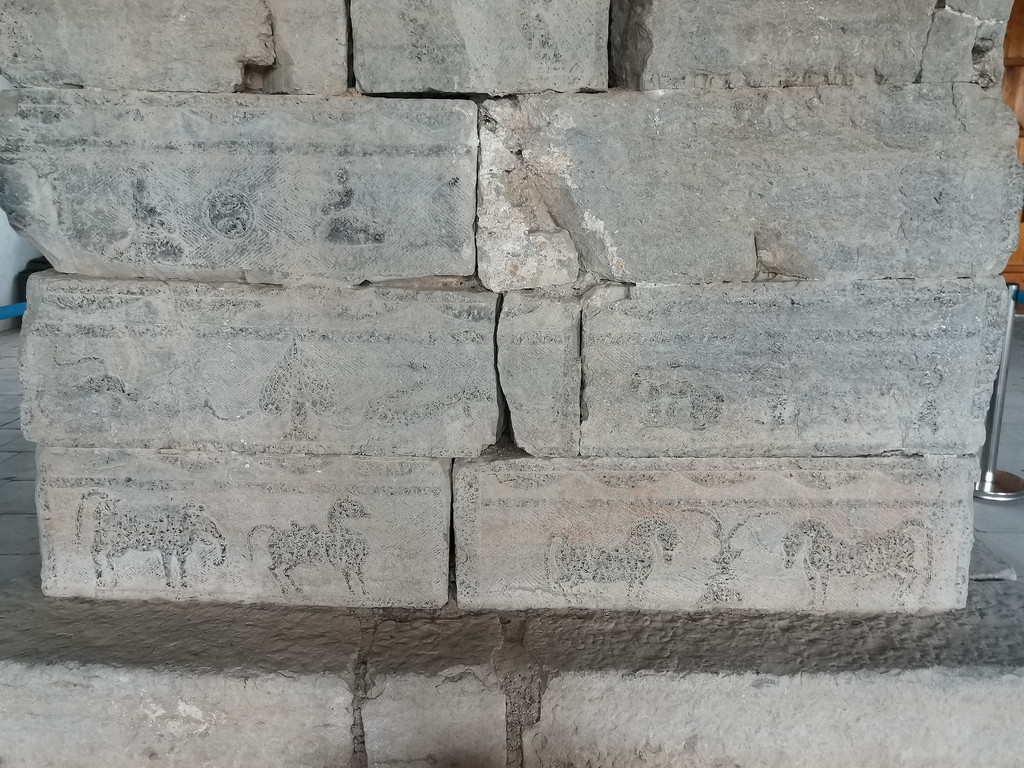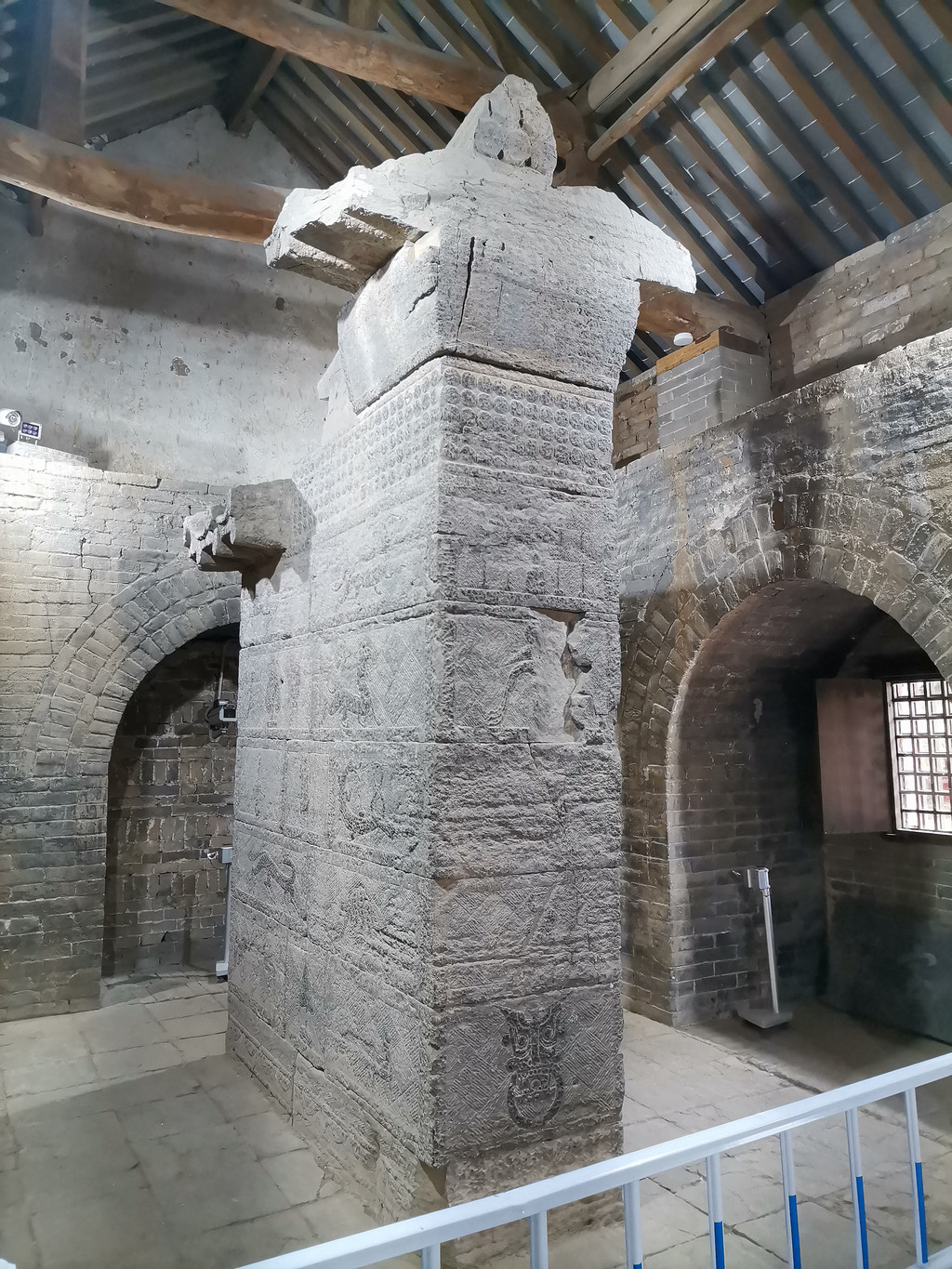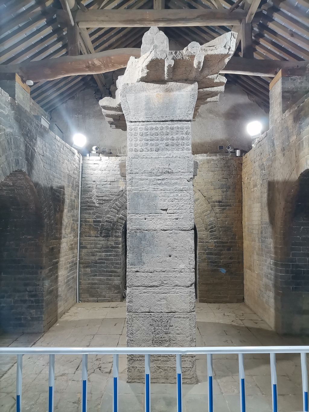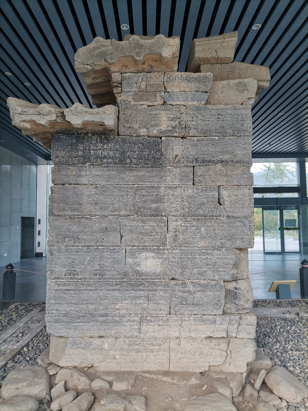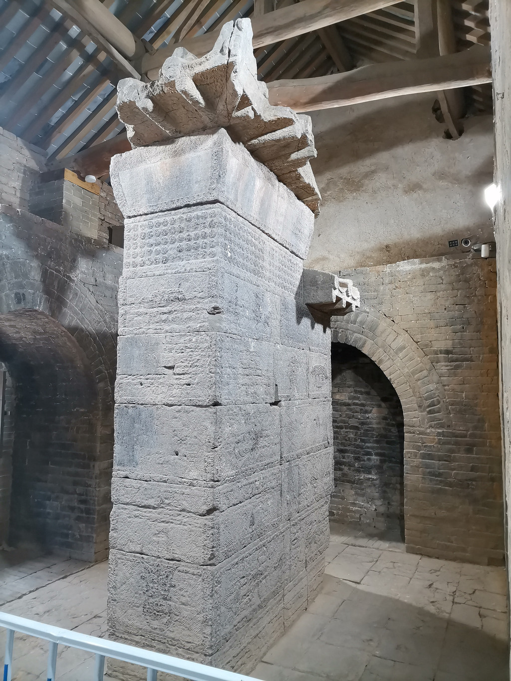 作为国家首批重点文保单位当中的002号古建筑,它建于东汉安帝延光二年,公元123年,属子母阙,阙体高约四米,两阙间隔近七米,用方正的石灰石叠筑而成。阙体表面的文字,因年代久远,所余不多,却是中岳汉三阙中图案最为清晰的一处。剩余的60余幅刻象中,有驯兽图,蹴踘图,拜谒图,狩猎图,青龙自虎图,交龙车马出行图,鹭鸟食鱼图,斗鸡图,比翼鸟,奔鹿图等,图案多用减地平雕的手法,线条精炼,兼具写实与写意之美,典型的反映了秦汉时代石刻造像的雄劲大气。