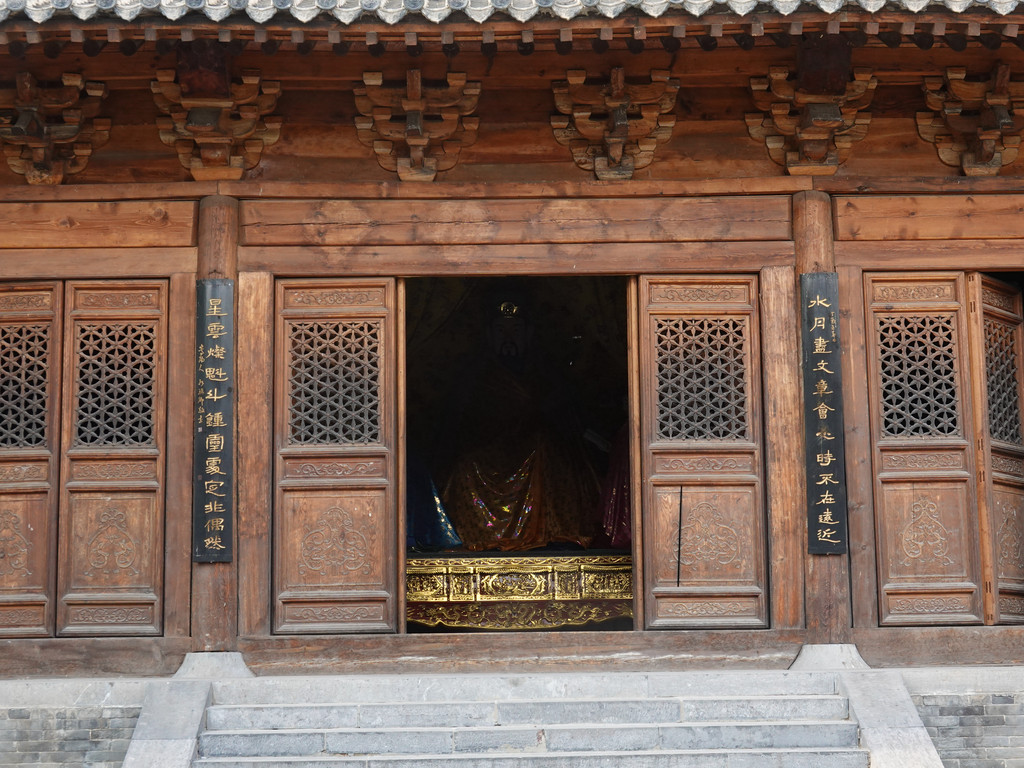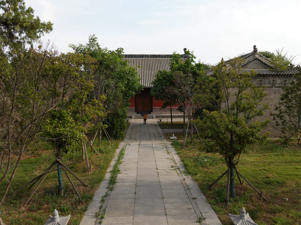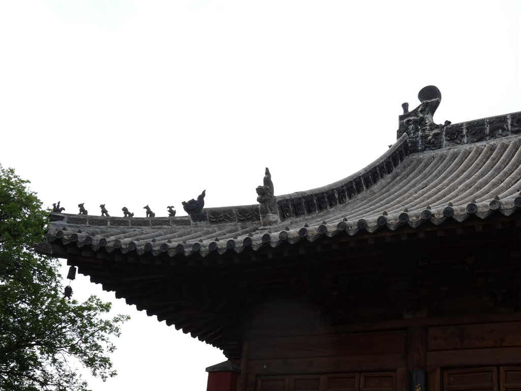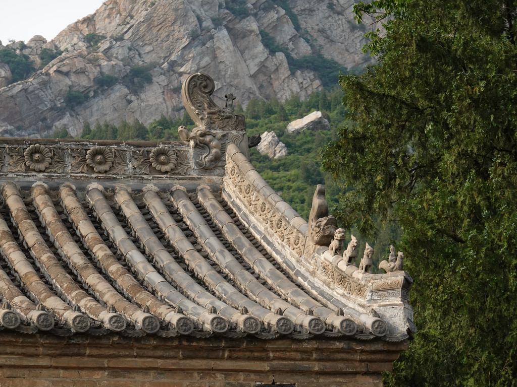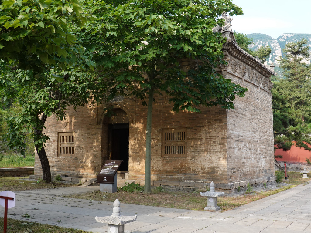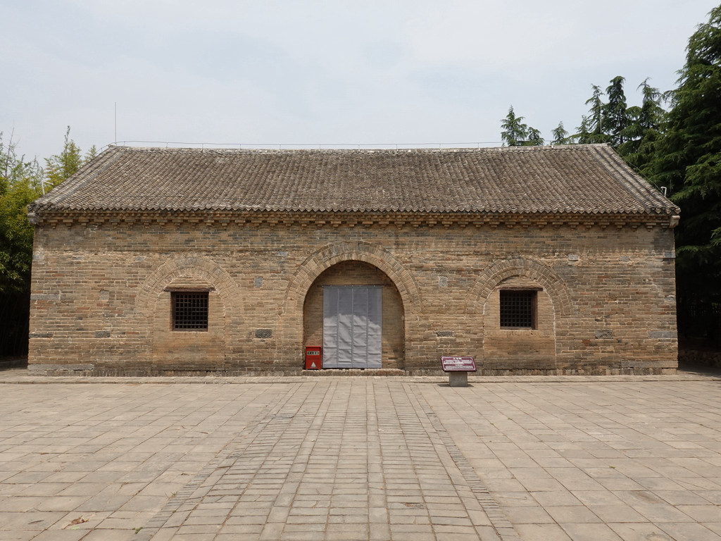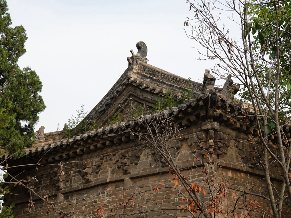 三元殿,建于清己巳年,为三间灰色筒瓦歇山房,四角有四大组转角斗,后檐和两山各施五组,前檐施有八组,斗均用砖磨制雕刻而成,淳朴坚固。