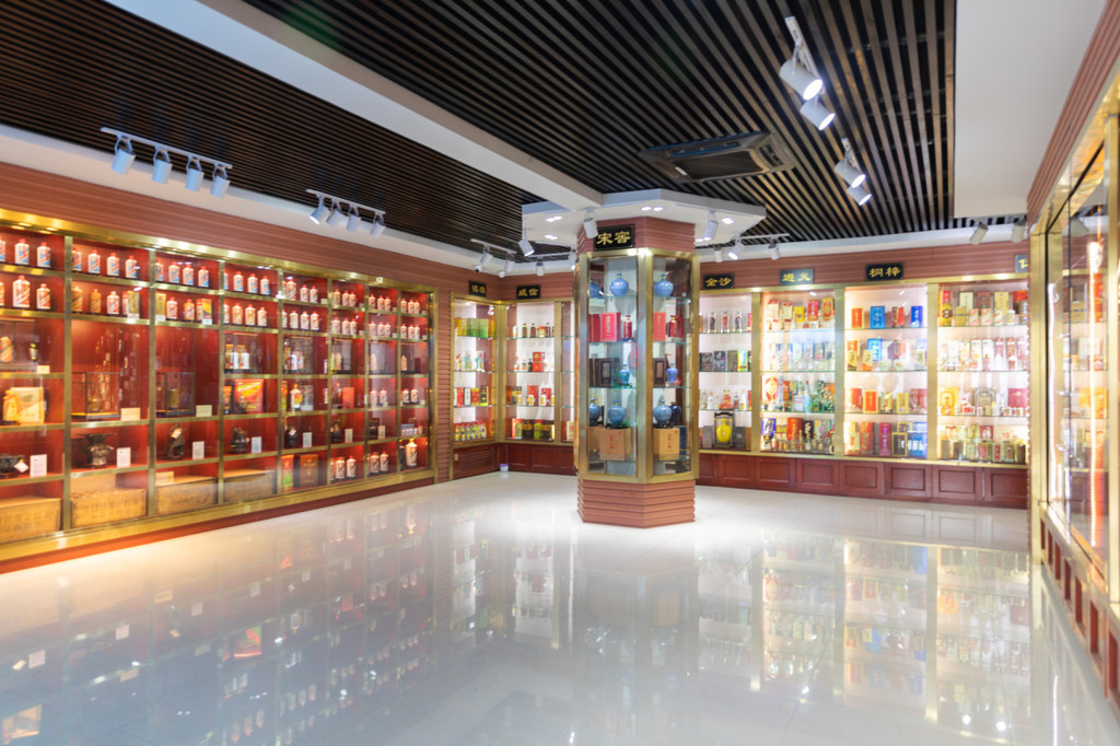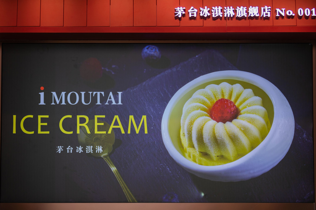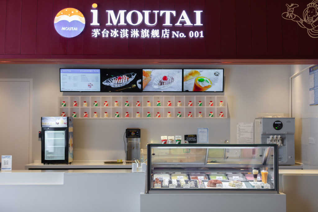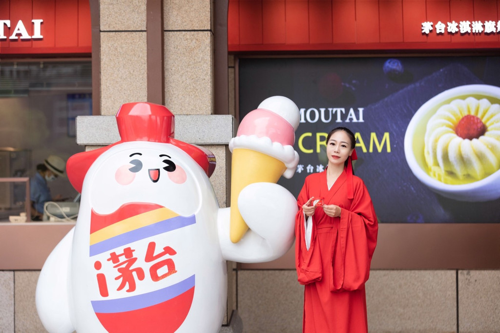 旗舰店的门口有茅台的酒瓶和卡通玩偶,可以与它们一起合影,然后在窗口买一款自己喜欢的冰淇淋。