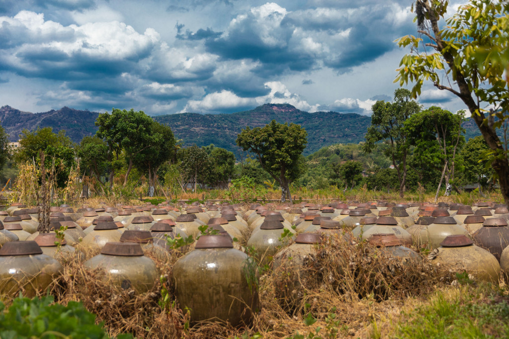 赤水 晒醋选用上百种中草药曲和麦麸、小麦、大米等粮食原材料,经草本配制、醋曲制作、米粥糊化等十二大工序和长期日晒夜露酿造而成。