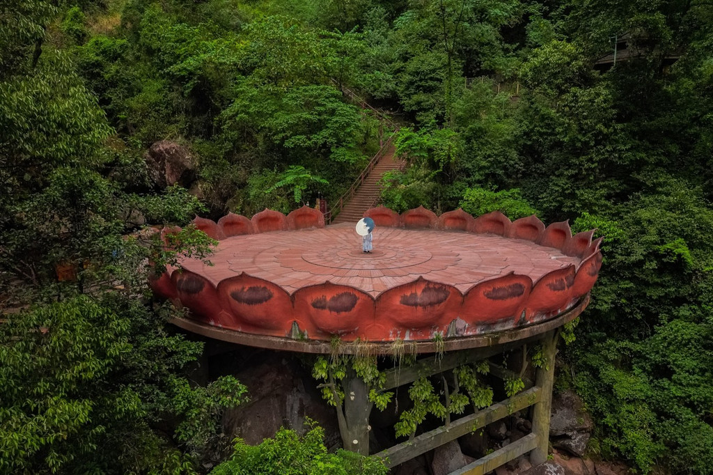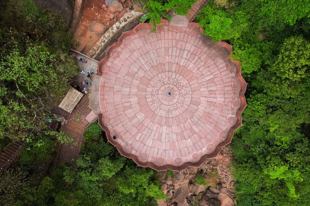 午后阳光照射下的佛光岩丹霞似火, 血红的岩壁与雪白的瀑水相互融合,站在莲花台,可将壮观景象一览无余。