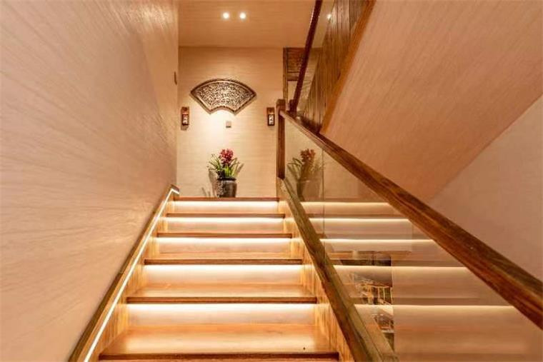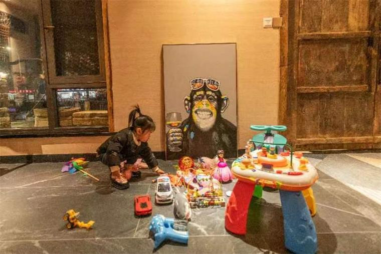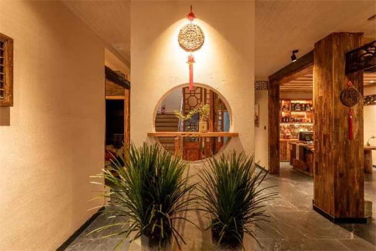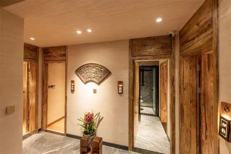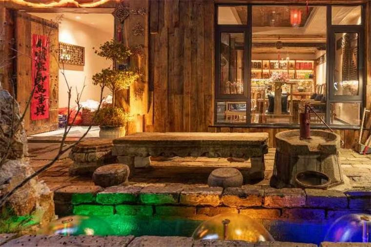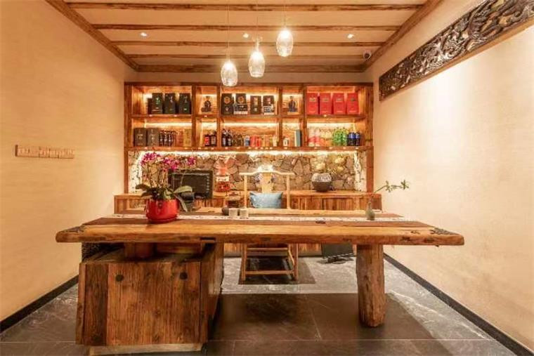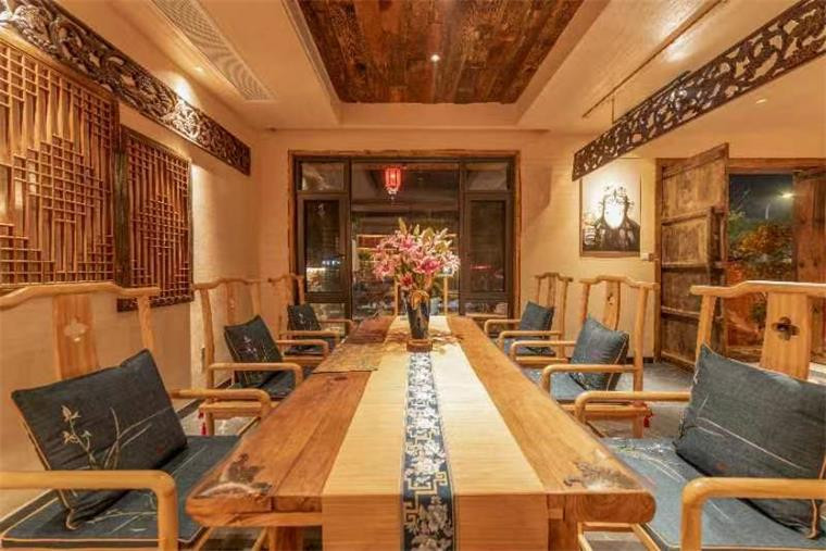 大厅和室外装饰以老木料、老木头、老石座、老石墩为主,设计理念突出“朴”为主题,不经修饰,原计原味风格,淳朴而厚实质感,大厅茶桌和吧台是老榆木门板材料建成的,突出“朴”而不飘,具有强烈的沉淀厚实感!特别有一种云南感,古里古气,木质结构与全屋智能的现代科技相结合竟然一点违和感都没有。