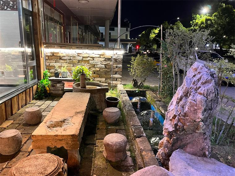 特色亮点:进店门口的一对大门是近百年的老古门原式样安装,风格独特。外墙壁是用老木板的木饰面挂靠装饰,凹凸立体感强,门口还有一口老石框手压老水井,可供来客者打卡,门口老石台是千年自然形成的化石,水浇湿石台后,虫形化石印记历历在眼前,时光回往火山千万年后造就成眼前的虫形化石即在眼前。