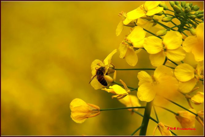 我们从青龙台下山来到油菜花地,走在数万亩金黄的油菜花里,那蜜蜂采花蕊的嗡嗡声在耳边儿轻盈悦耳。于是,我们开始追逐蜜蜂,追拍着一个个的蜜蜂。然而,无奈拍片技术有限,被那蜜蜂儿逗得满花地儿转,拍出来的效果,堪称一般一般。据景区的资料介绍,潼南县目前的油菜种植面积已经达到了三十万亩,其中,在崇龛核心区的油菜种植面积有三万余亩,油菜品种已达五十余个。这届油菜花节整合了潼南独具特色的“红色”、“绿色”、“古色”三色旅游资源,将潼南县城至崇龛、崇龛至双江大环线范围的景点皆纳入菜花节旅游线路之中,形成了从潼南县城--柏梓--菜花节风景区--杨尚昆故居--双江古镇--杨闇公故居--潼南大佛寺--桂林蔬菜基地的旅游环线。在这条环线上,每两公里就有路标,绝对不会迷路走错道。在青龙台、烟波岭等高地观景台,可将景区三万余亩菜花尽收眼底。