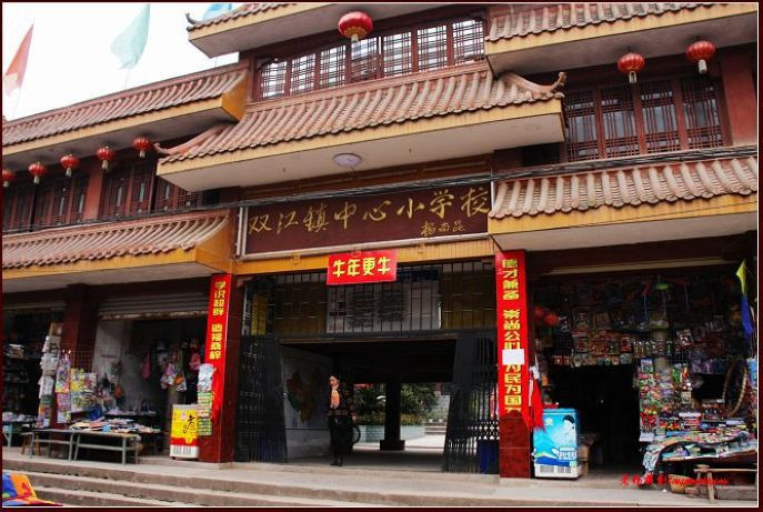 古镇上的房屋历史都比较久远,部分是明清时期的建筑,保存非常完好,别具一格,点缀在古镇上,形成了一条独特的风景线。离镇政府不远有一处古建筑,那便是“双江镇中心小学校”。该小学集古典和现代建筑为一体,环境幽静,是育人的理想场所。据载,“潼南县双江镇中心小学校”是前国家主席杨尚昆的父亲杨淮清老人于1928年倡议创办的,杨尚昆主席曾三次视察学校,并为学校题写校名。我们进去拍照时,学生们还在上课。偌大的庭院坝里,没有学生,那门上的台子十分壮观,可以想像当年的那种霸气和壮丽。学校里面的古建筑保护得很好。从双江镇中心小学校出来,看见许多人围在隔壁双江小学幼儿园门前。一打听,大家都是在等候接孩子回家的爷爷、奶奶和他们的父母。我们才发现已经快中午十二点了。于是,我们随着接孩子的家长们进了幼儿园。园里的房屋仍然是古色古韵。双江古镇地处涪江下游潼南县城西北面的双江镇,建于明末清初,是仅次于县城梓潼镇的第二大镇,因镇两侧的猴溪和浮溪蜿蜒环绕故名双江。古镇以清代为特色的院落庭园星罗棋布,古色古香的四合院落门坊柱壁多雕饰精美,四角飞檐高翘,院落深深,天井花园设计造型精美,四季花木繁茂,为典型的巴蜀古镇风韵。孩子们在老师的组织下,秩序很好地站在古屋下等候家长来接。家长来了,同老师打招呼,然后接走自己的孩子。一切都是那样的有条有序。