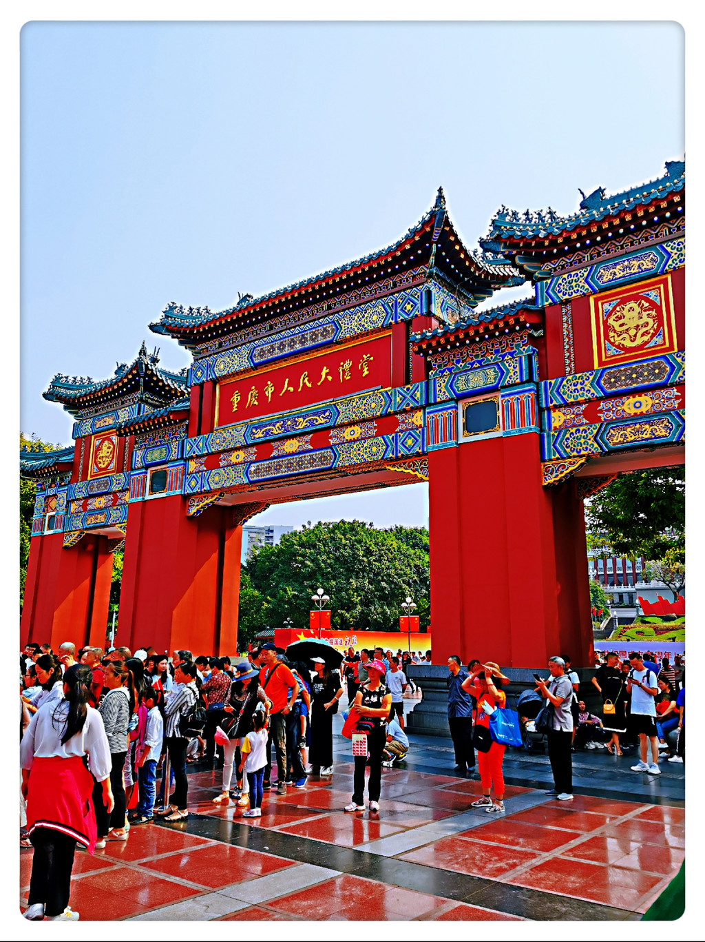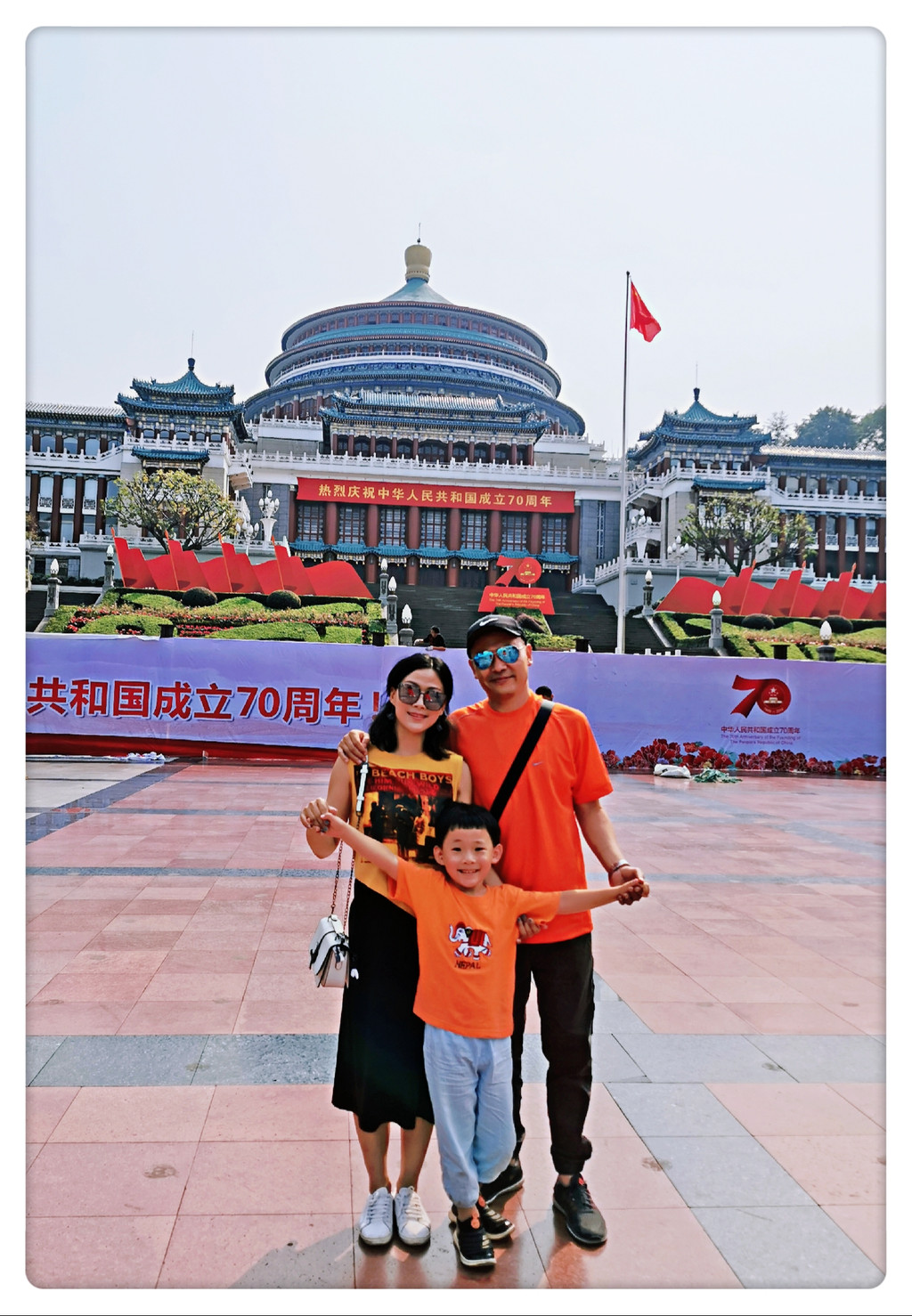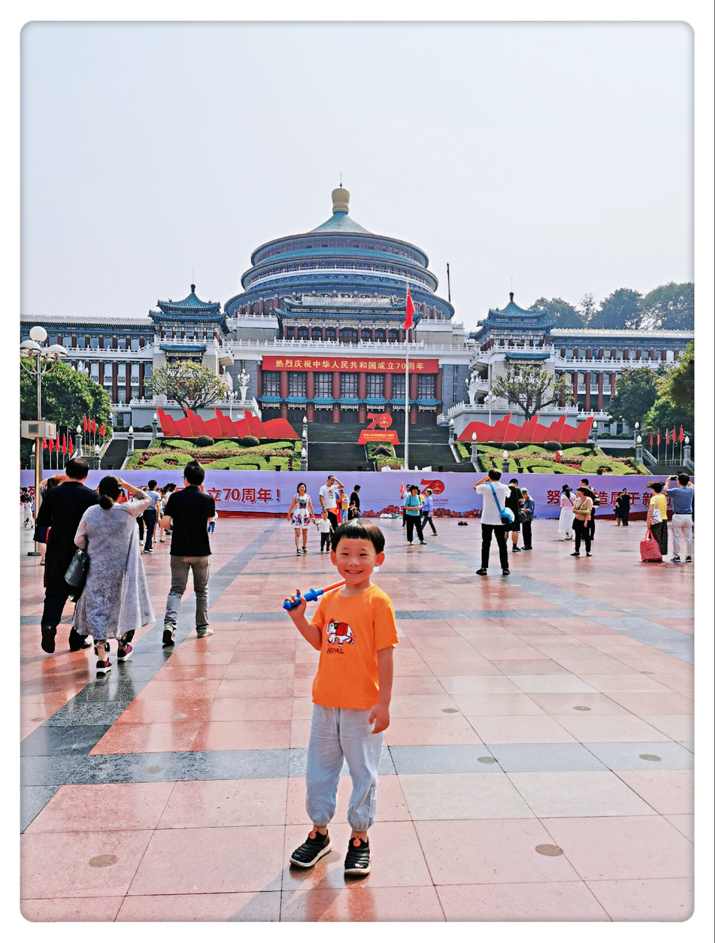 今天的第一站——重庆人民大礼堂,做攻略时,就被她迷人的外表、精美的建筑特色所吸引。在外观上,大礼堂仿造了天坛的祈年殿,传统的中轴线对称的建筑结构,是重庆的地标之一。不巧的是我们去的时候,恰逢祖国70华诞,大礼堂不对外开放,我们只能在外面一睹她的容颜啦。
