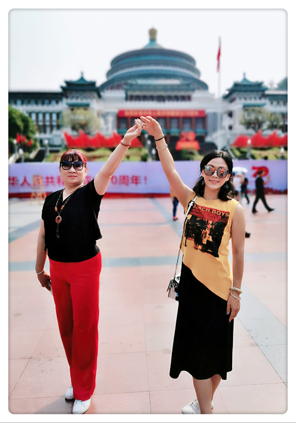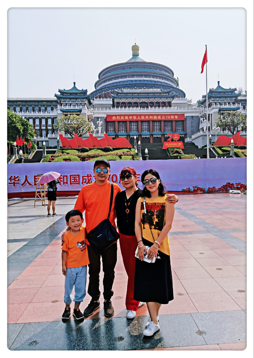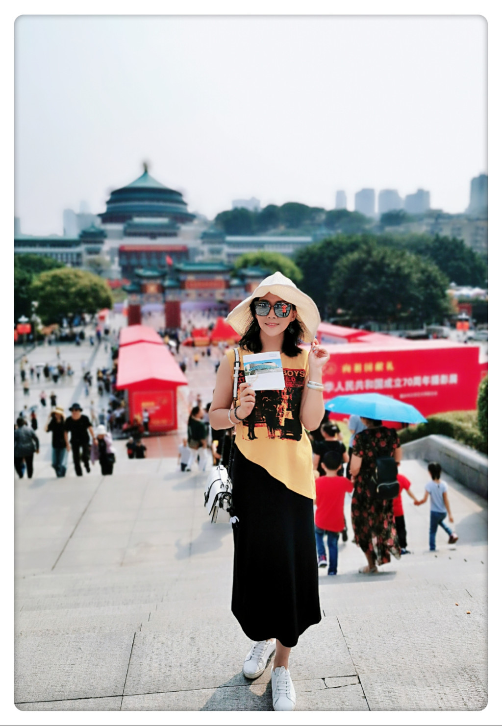 今天的第一站——重庆人民大礼堂,做攻略时,就被她迷人的外表、精美的建筑特色所吸引。在外观上,大礼堂仿造了天坛的祈年殿,传统的中轴线对称的建筑结构,是重庆的地标之一。不巧的是我们去的时候,恰逢祖国70华诞,大礼堂不对外开放,我们只能在外面一睹她的容颜啦。