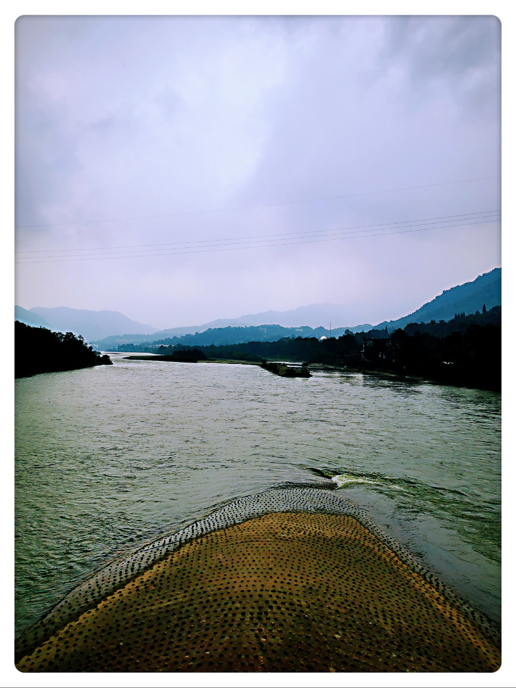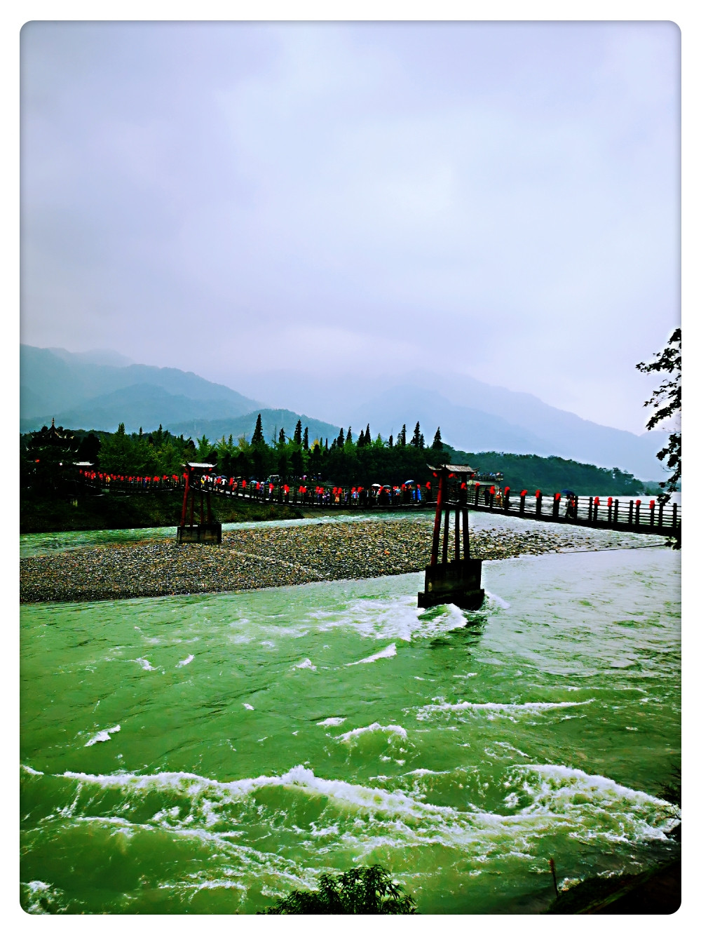 都江堰水利工程由鱼嘴分水堤、飞沙堰溢洪道、宝瓶口引水口三大主体工程和百丈堤、人字堤等附属工程构成,把汹涌的岷江分隔成外江和内江,外江排洪,内江引水灌溉,使川西平原成为“水旱从人”的“天府之国”。两千多年来,一直发挥着防洪灌溉作用。都江堰水利工程周边景色秀丽,文物古迹众多,主要景点有伏龙观、二王庙、李冰石刻像、安澜索桥、玉垒山公园等。我们现在就是站在鱼嘴分水提。