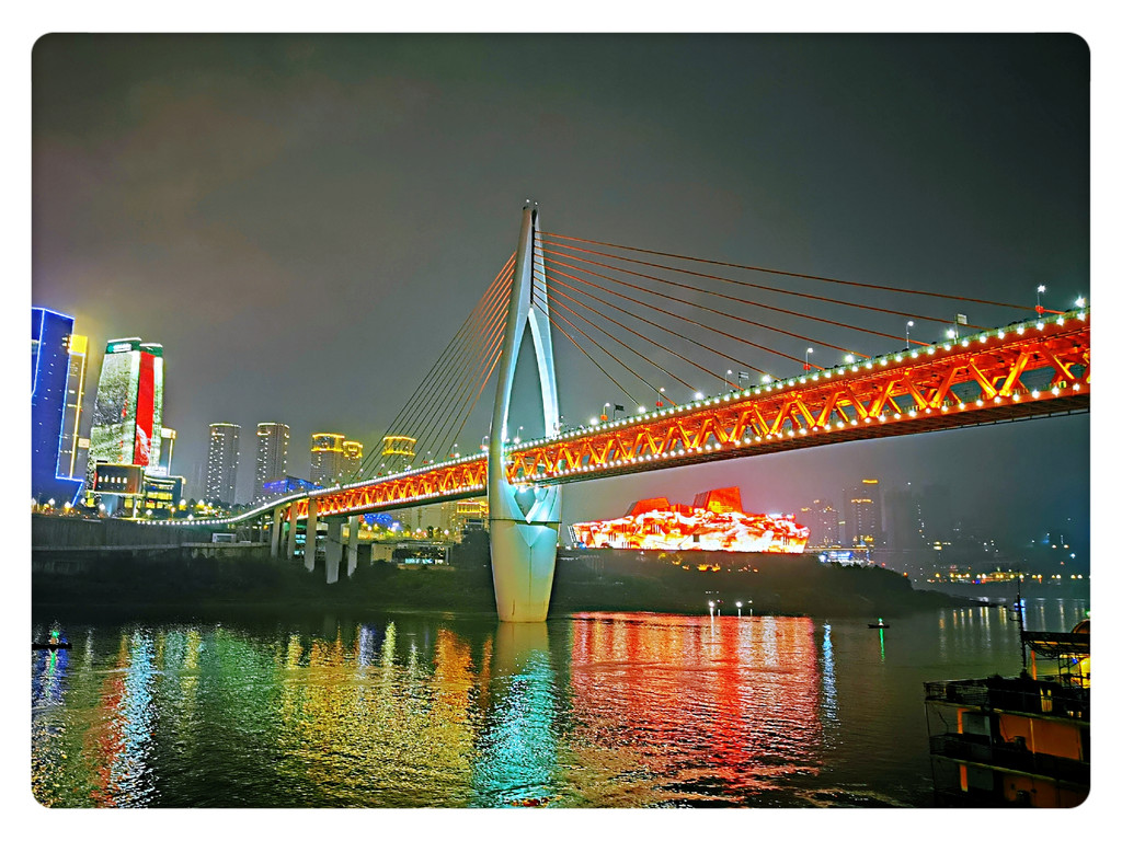 千厮门大桥连接了重庆市渝中区与江北区,横跨了嘉陵江,位于洪崖洞旁边,可以直接从大桥走到洪崖洞的楼顶,在嘉陵江大桥上拍摄洪崖洞是不错的位置,可是我们正赶上国庆黄金周,游客超多,所以这个时候在去到大桥上是不可能了,我们就只好在洪崖洞这边看向大桥了。晚上的千厮门大桥真的很壮观,灯火通明,横跨在嘉陵江之上,像一条红色长龙一样。