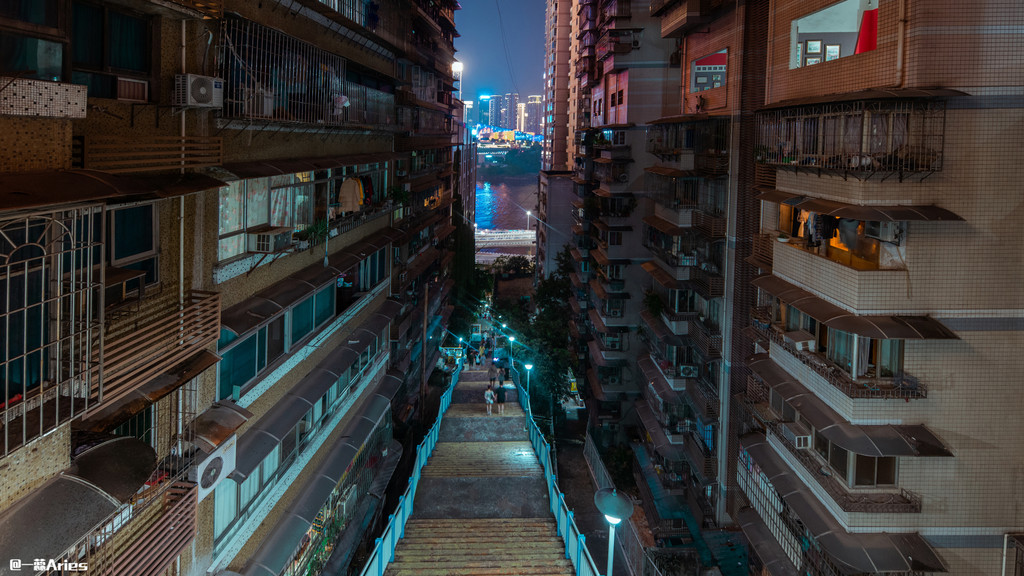 连接楼与楼之间的平台到了夜晚视野极佳,从走廊末端望出去,渝中区的夜景尽收眼底。