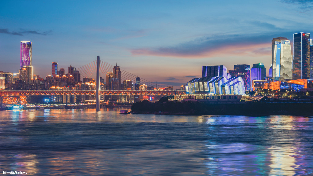 落日的余晖给整个城市披上一层金色的光芒,千厮门大桥像一条红色的巨龙横跨在嘉陵江上。