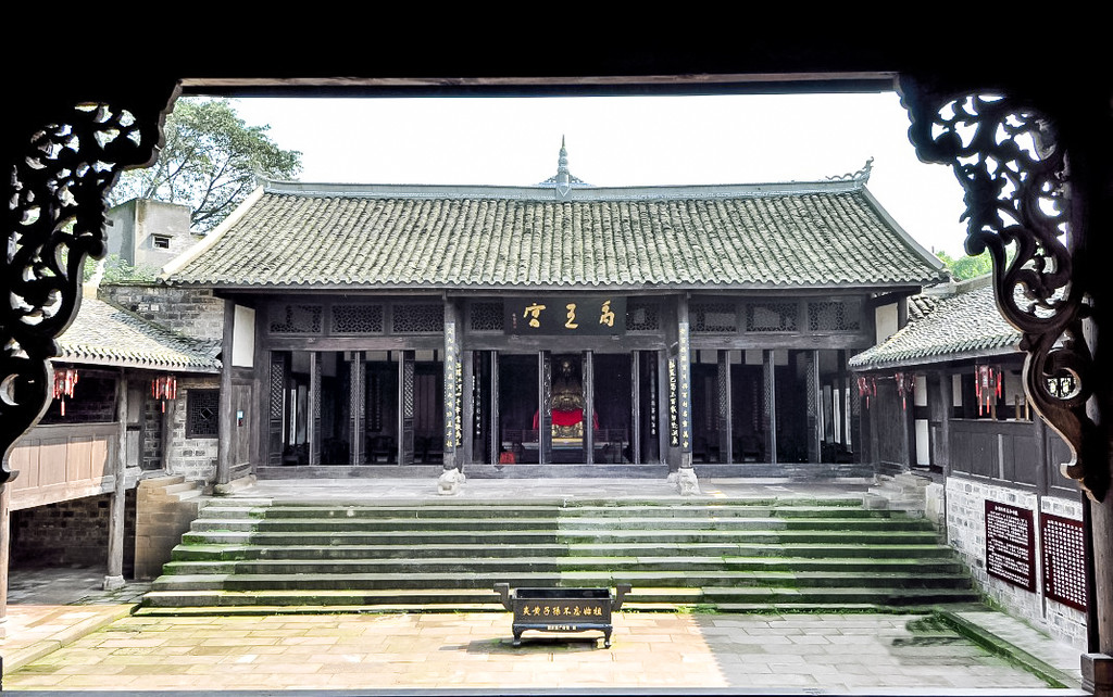 从尔雅书院出来,走进湖广会馆,则向我们生动展示了“湖广填四川”的移民史。它分为神殿、议事厅、厢房、戏楼、院坝五部分。正殿塑有禹王神像;两侧耳房,供会首议事;戏楼、院坝供聚会或文化娱乐;厢房供读书或食宿。