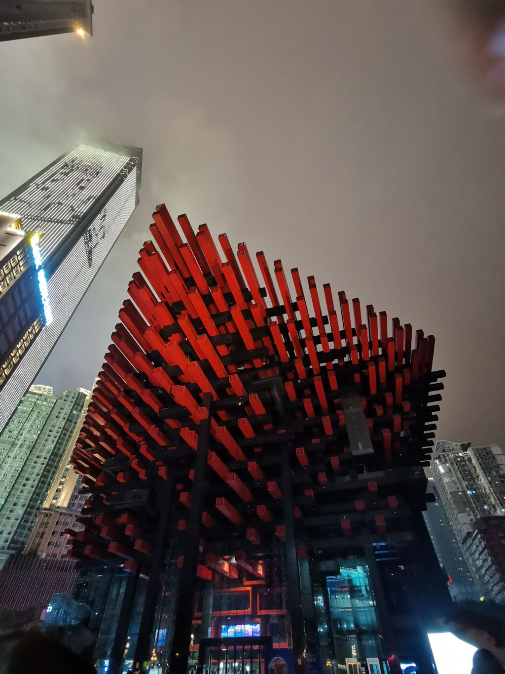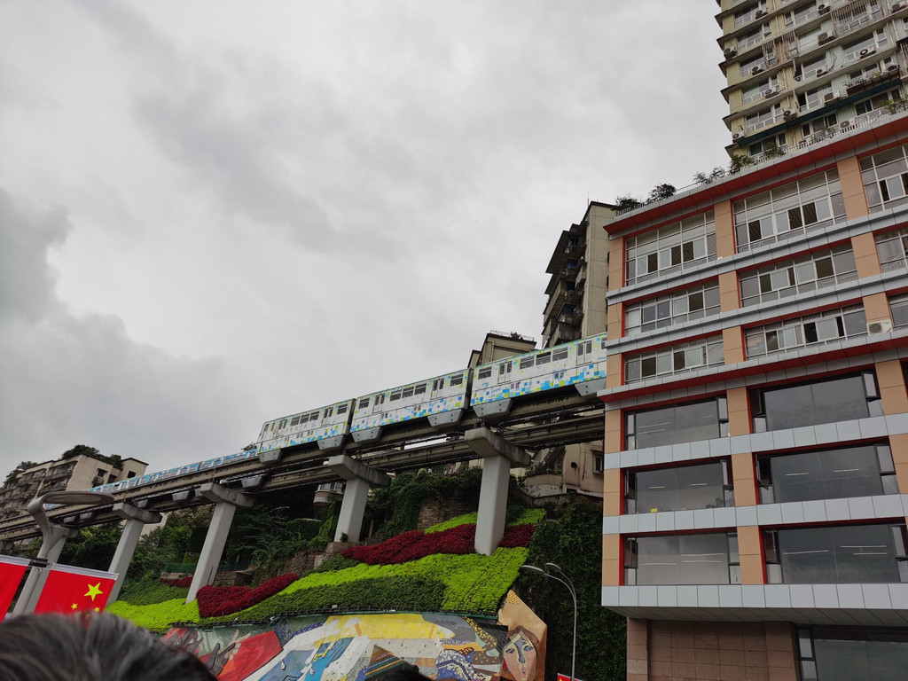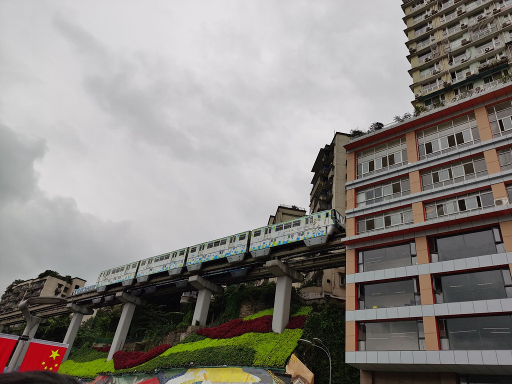 此次有幸坐上二号轻轨观江景、穿房楼。李子坝轻轨穿楼作为重庆网红景点之一,也是吸引了像我一样的很多外地游客慕名来打卡,从李子坝站点到观景台要下差不多五层楼,每每有轻轨表演“穿墙绝技”,大家就赶紧用手机记录精彩瞬间。观景台设有玻璃栈桥,与“轨道穿楼”拍摄区域合理错位。