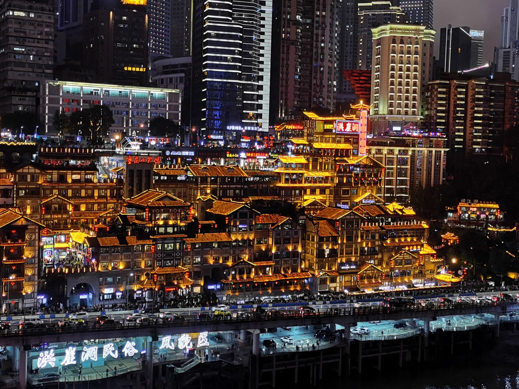 洪崖洞是重庆众多网红景点中毫无争议的C位。洪崖洞不是山洞,而是由一座座独具巴渝传统特色的吊脚楼建筑组成。所谓的吊脚楼,就是依山而建的房子,有一部分探出山体,需要用木柱子斜撑起来。但是,现代重新建造后,就摒弃了原有的外形,一律翻建成仿古建筑,建筑物按照地势而造,鳞次栉比,蔚为壮观。