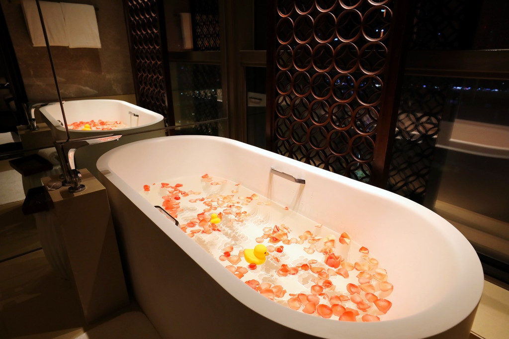 而很多入住酒店朋友,会和我一样喜欢上房间临窗的浴缸,特别是夜色下泡在浴缸里,看着窗外的霓虹,再来上一杯红酒,浪漫的夜不过如此易得。这里特别建议,每天晚感受不同的泡浴,因为酒店提供玫瑰、柠檬、泡泡可以随你喜欢任意选择。