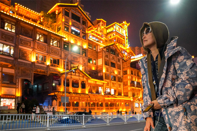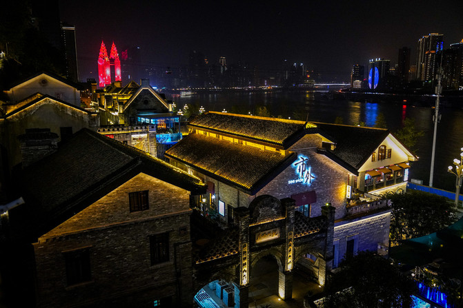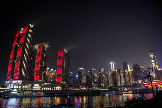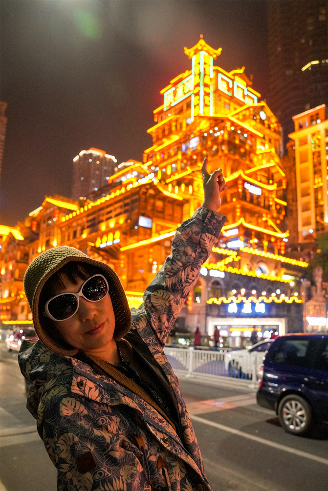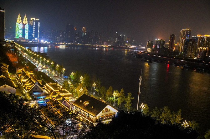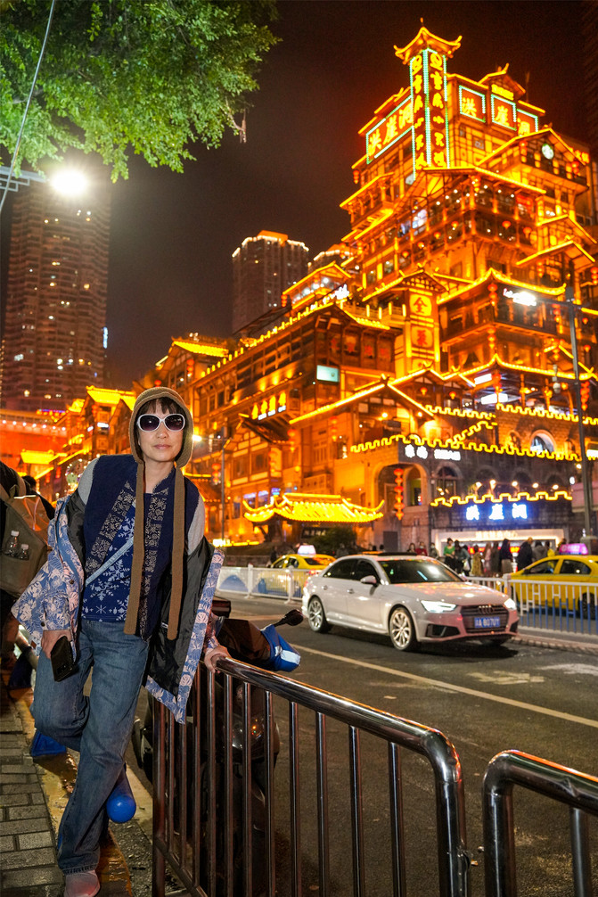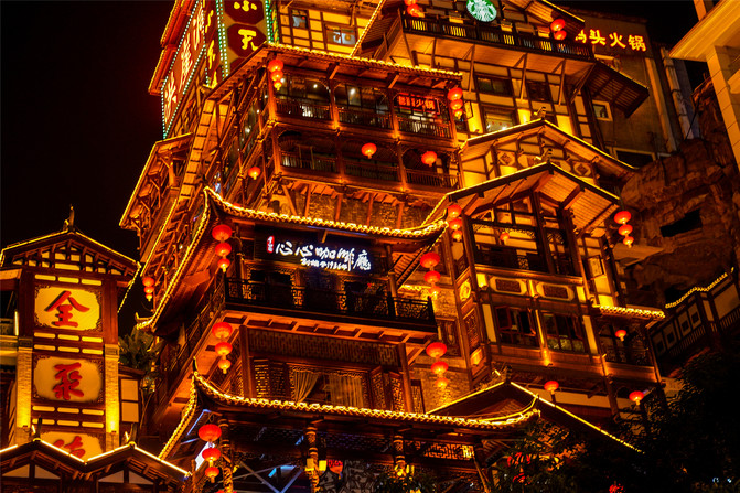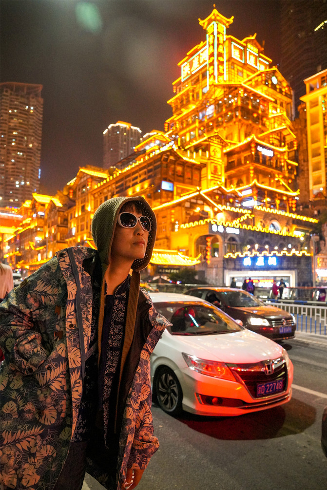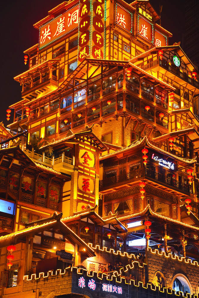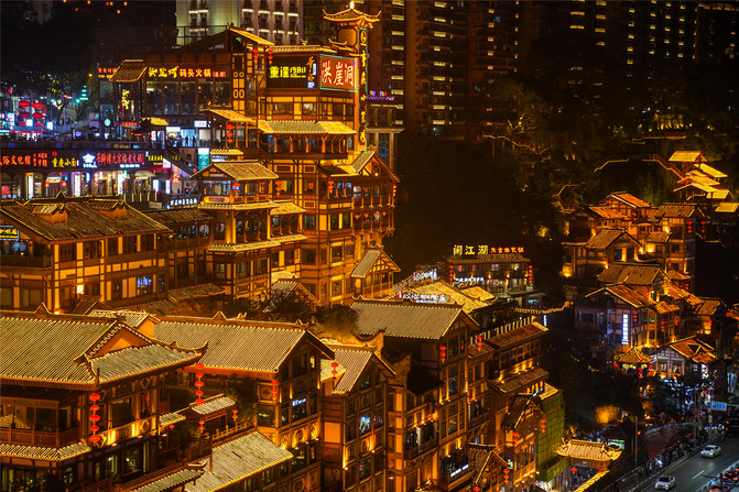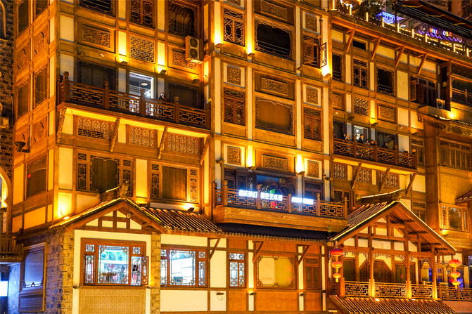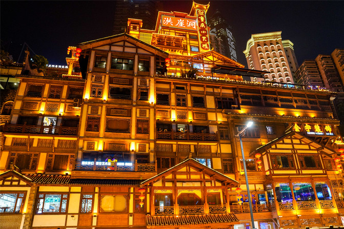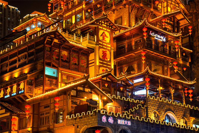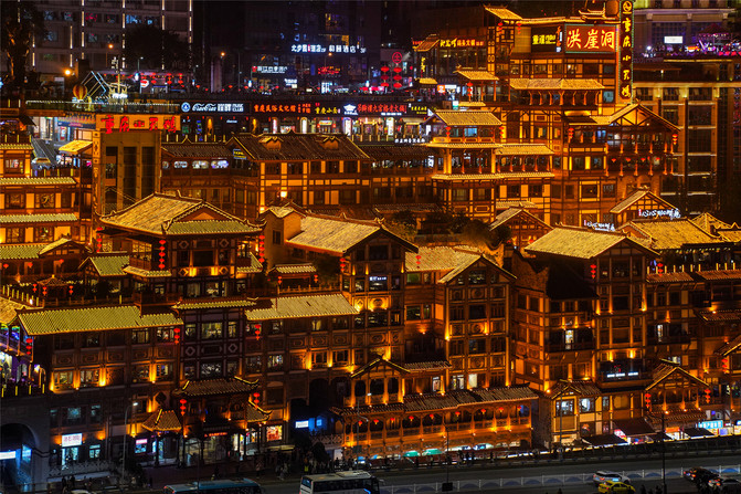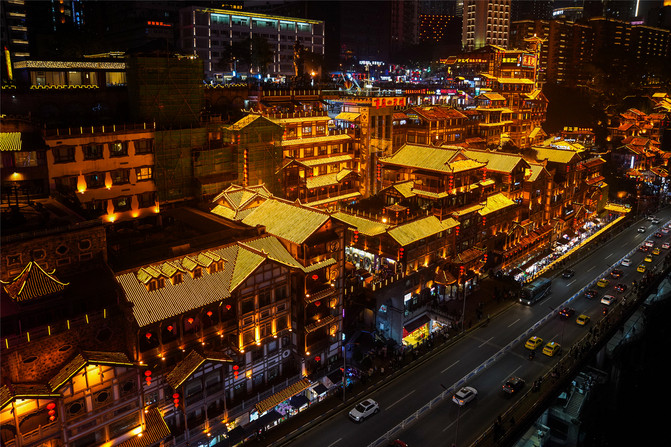 【洪崖洞】来重庆必打卡的地标之一。而每到节假日,洪崖洞更是当之无愧的流量大咖。洪崖洞原名红崖门,是古重庆城门之一,在原址的基础上,洪崖洞以最具巴渝传统建筑特色的吊脚楼为主体,依山就势,沿江而建,是别具一格的“立体式空中步行街”。短短几层楼,就汇聚了餐饮、娱乐、休闲、特色文化购物等六大行业,一时间华灯璀璨,风光无限,成为当之不愧的最具层次和质感的城市景区商业中心。夜晚的洪崖洞有着最让人熟知的一面,当它灯光刹那打开,就像沥上一层层金黄的颜料,恍若千与千寻的梦幻感,分分钟像穿越到二次元的空间中。这是在地面拍摄的场景。拍照出片指数:★★★★★