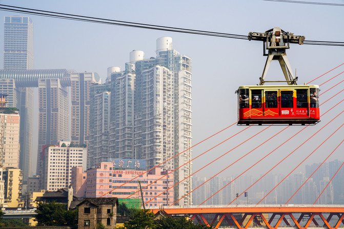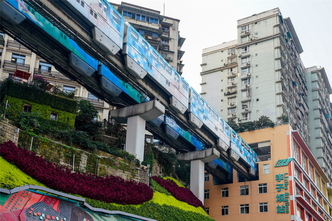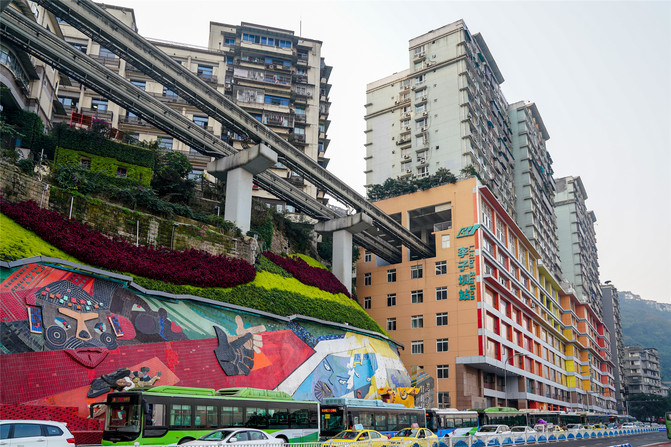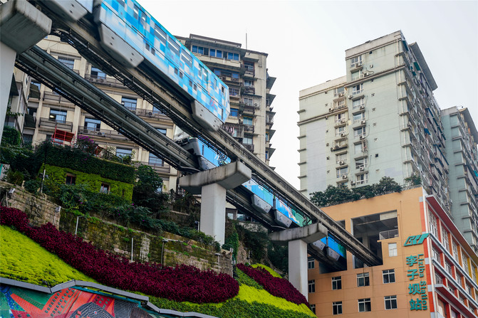 【重庆单轨2号线李子坝车站】是中国第一座与商住楼共建共存的轨道交通(跨座式单轨制式)高架车站,于2004年3月建成,占地面积3100平方米,建筑面积6000平方米。该站位于嘉陵江南畔的李子坝正街39号商住楼6-7层,因其“单轨列车穿楼而过”成为蜚声中外的“网红车站”。乘2号线临江门-佛图关一带,在车头或车尾,都有大玻璃窗供游客拍视频,如同城市过山车。这里拍视频的出片指数:★★★★★
