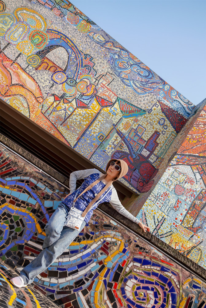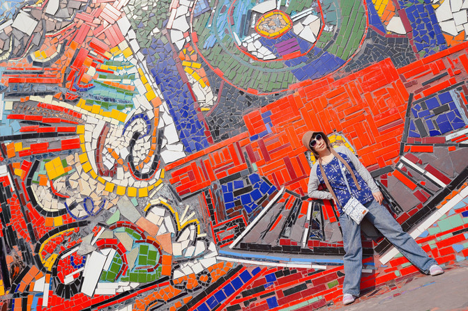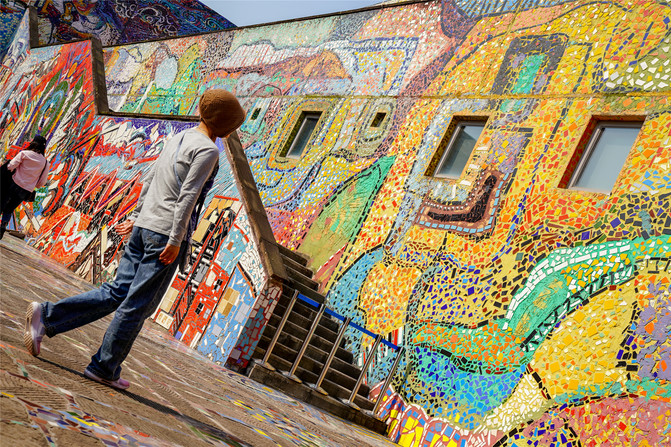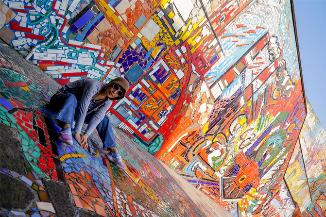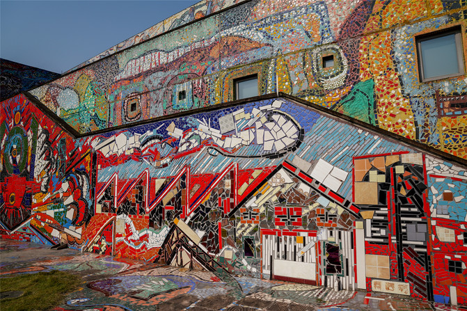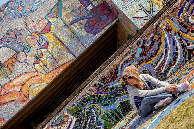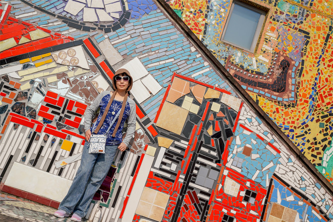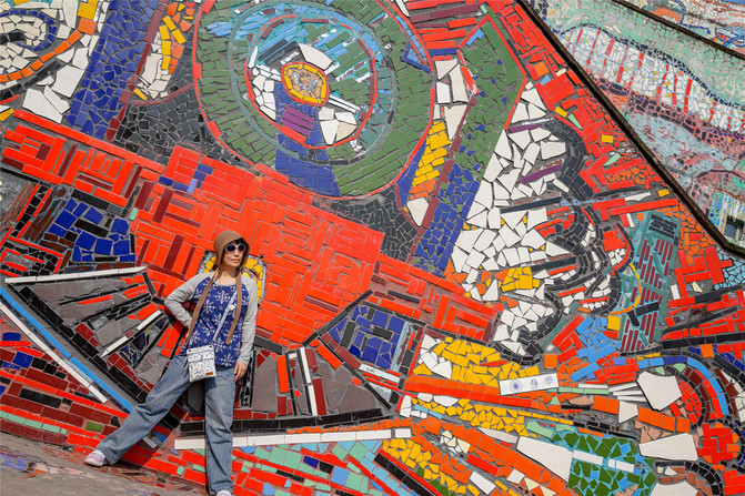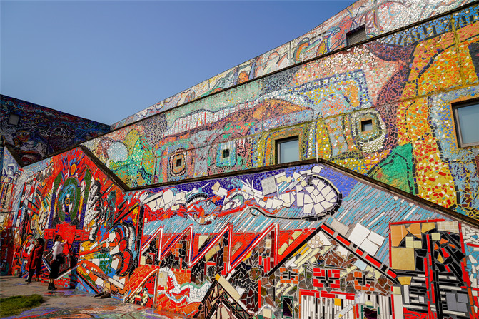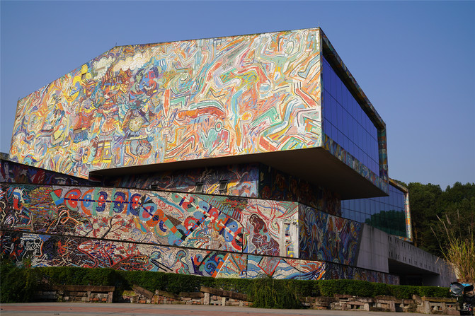 【罗中立美术馆】所有建筑的外立面,用无数块彩色的碎瓷砖一块块拼起来的,而不是油彩,这些瓷砖全部是川美到各个工厂里去收购的废弃瓷砖。外墙面满满覆盖着鲜艳、跳跃、灵动的色彩和图案,这些图案有动物、植物、人物、建筑,有写实的、也有抽象的。在外墙上连成一圈起伏跌宕的画卷,这种震撼的感觉,你一定要在现场才能体验到,像这样全部被彩色图案覆盖的美术馆,在世界上你可能找不出来第二个。美术馆的外墙壁也是一件巨大的艺术品。地址:川美沙坪坝校区 拍照出片指数:★★★★★
