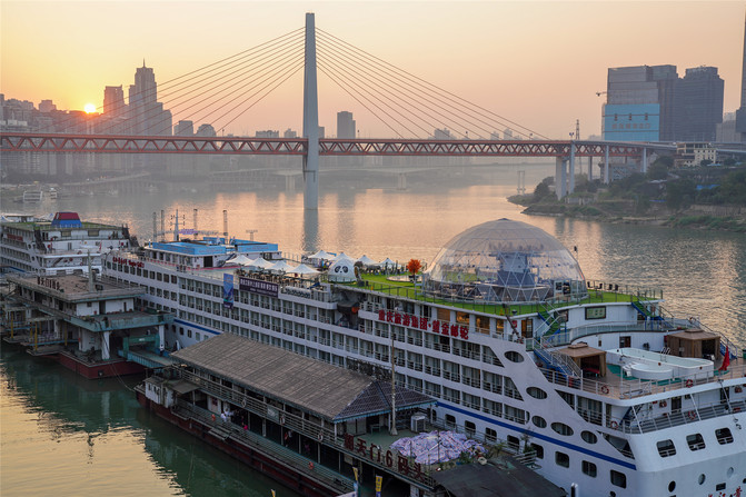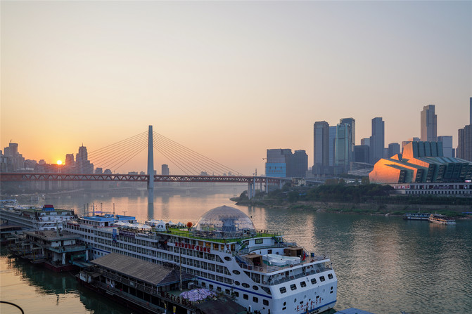 【朝天门】位于重庆渝中区渝中半岛的嘉陵江与长江交汇处,长江的九大主要支流之一的嘉陵江在此与长江汇流,一泻数千里注入东海。著名的长江三峡就在重庆至宜昌航段,所以,人们把重庆作为游览壮丽的长江三峡的最好起点。