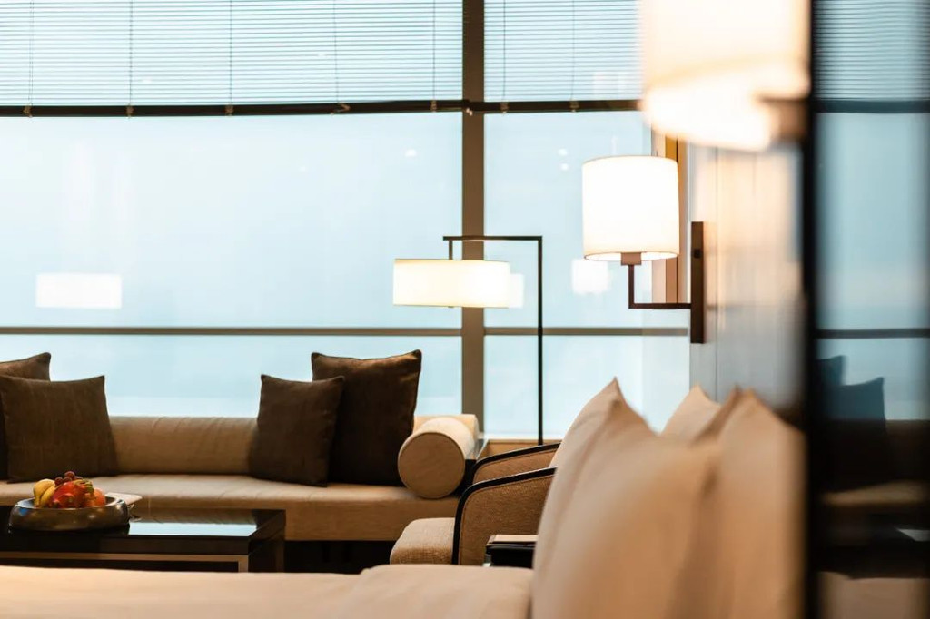 晴方好的黄昏时有斜阳进来,有一种隐约的“侘寂”之美,即便是阴天,江面泛起天青色的波纹,素锦的缎面质感美得沉静;及至晚上,灯火辉煌的夜景下,被车河拉出丝光火弧的大桥像一条长龙延伸至远方;入夜后,伫立在幕墙玻璃窗边,从300多米的高空,俯瞰城市的车水马龙,而自己置身于舒适的静谧空间,喧嚣与浮华都与你无关……