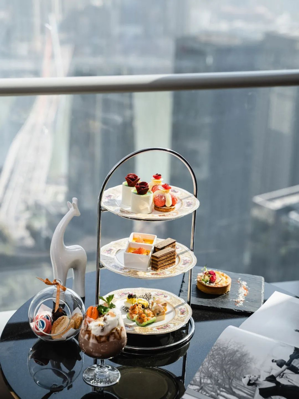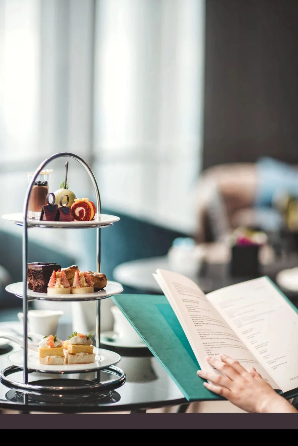 与欣厨不同,大堂吧悦廊是重庆首屈一指的网红下午茶地,巨幅艺术作品被巧妙地融进了划分空间的格栅中,提供了宁静和迷人的环境,蓝色织物装饰让人放松的沙发,敞亮的空间经常配着舒缓的音乐,我们家小姑娘都喜欢窝在这里的沙发里看书。他们家菜单用的Tiffany蓝色皮套,化妆镜的设计深得女士喜欢——我数次萌生念头想买一本回家。