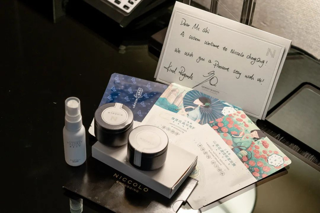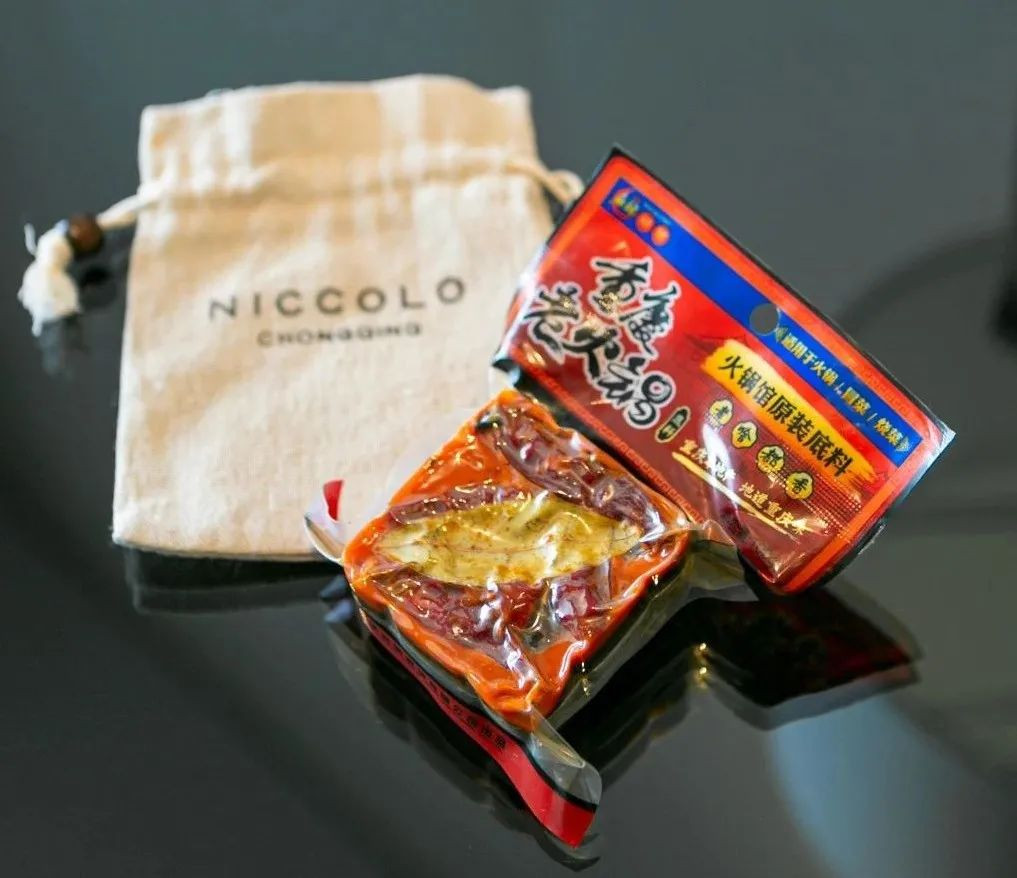 最大的惊喜则来自于,当我在62楼吃得太撑回房休息,夜床已开好,开床礼是一袋特色重庆火锅底料。询问后方知,酒店有7种开床礼——Lorenzo Villoresi特别定制的旅行套装,内含洁面乳、眼部啫喱、润唇膏和晚霜各一支/8ml、枕头喷雾、火锅底料、沱茶、面膜、明信片,甚至还有蒸汽眼罩等,至于碰到什么就看运气了。
