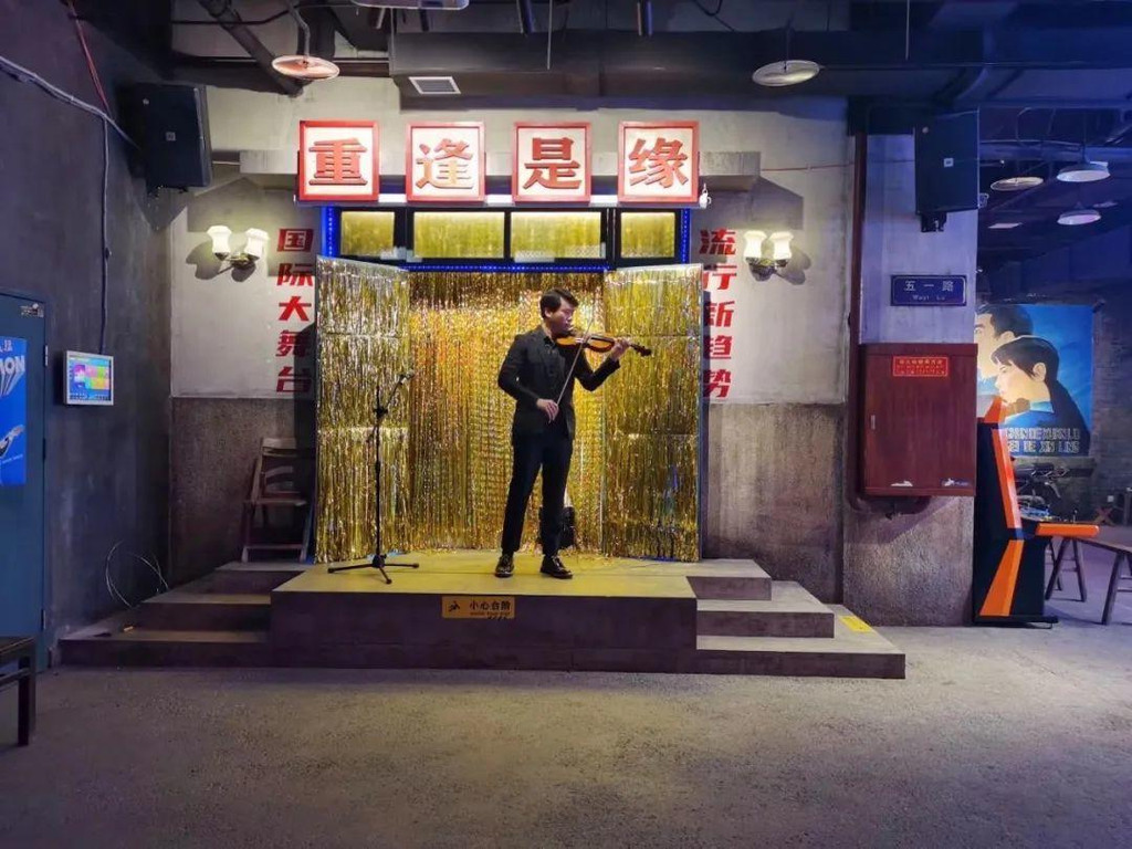 复古街区还有真实和虚拟的表演,艺术家在接头的舞台上演奏小提琴,观众还可以裸眼观看3D全息影像的邓丽君演唱经典歌曲。