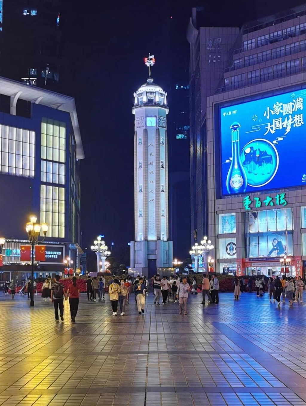 白天的解放碑人头攒动,入夜后更是热闹非凡。