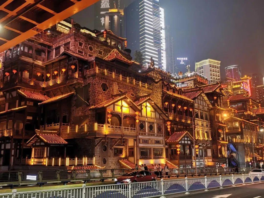 其实洪崖洞的建筑并没有借鉴动画灵感,而是联排的干栏式吊脚楼,属于巴渝传统建筑,洪崖洞背后是解放碑的林立高楼,古老的传统和现代的设计交相辉映,一种魔幻的氛围油然而生。