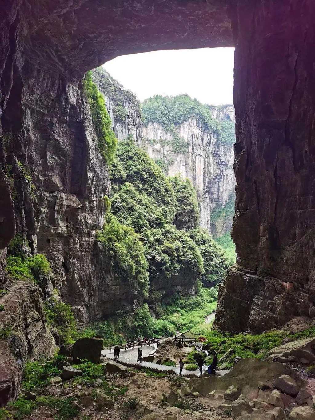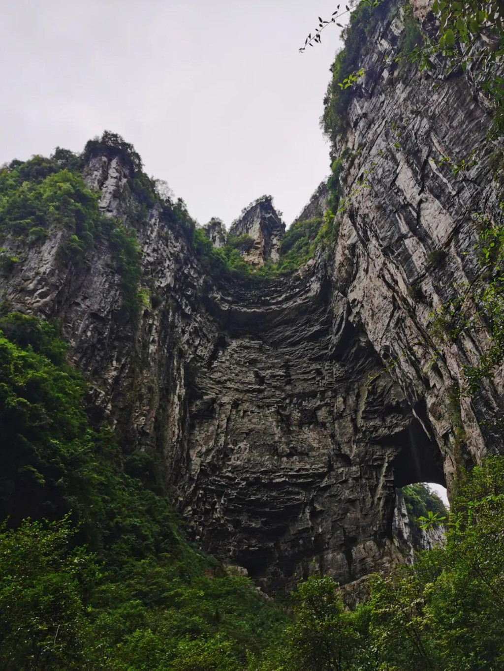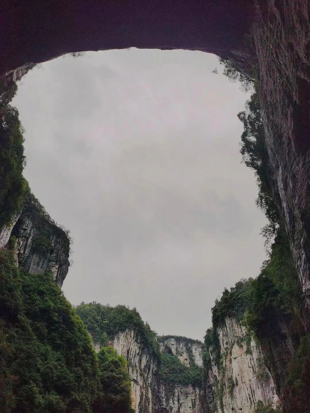 从不同的角度看天坑,呈现出不同的形状。在天福驿站抬头仰望,天桥和山峰合围一圈,真的貌似天开了一个洞。