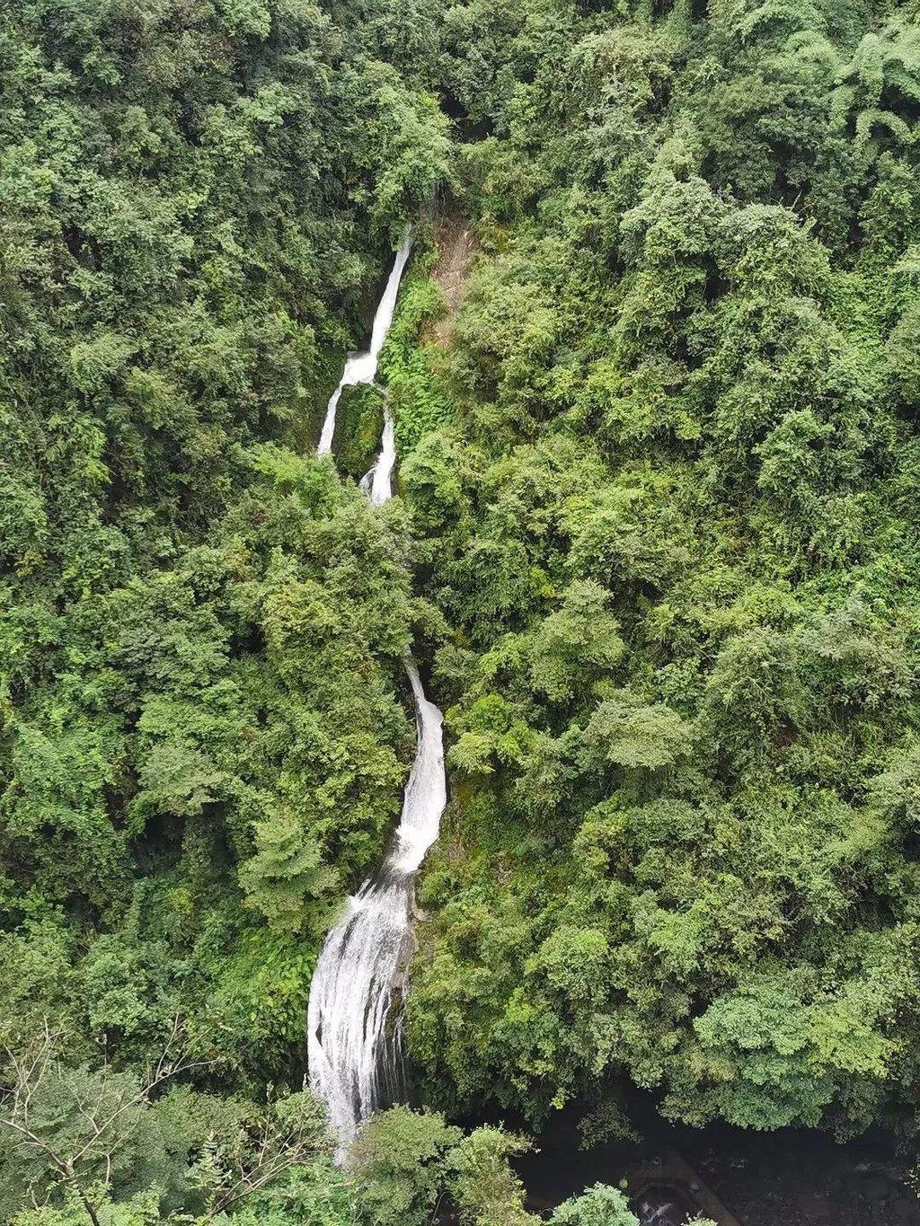 山道弯弯嵌绿树,瀑水从树缝隙间潺潺而下,翠音悦耳,沁人心脾。