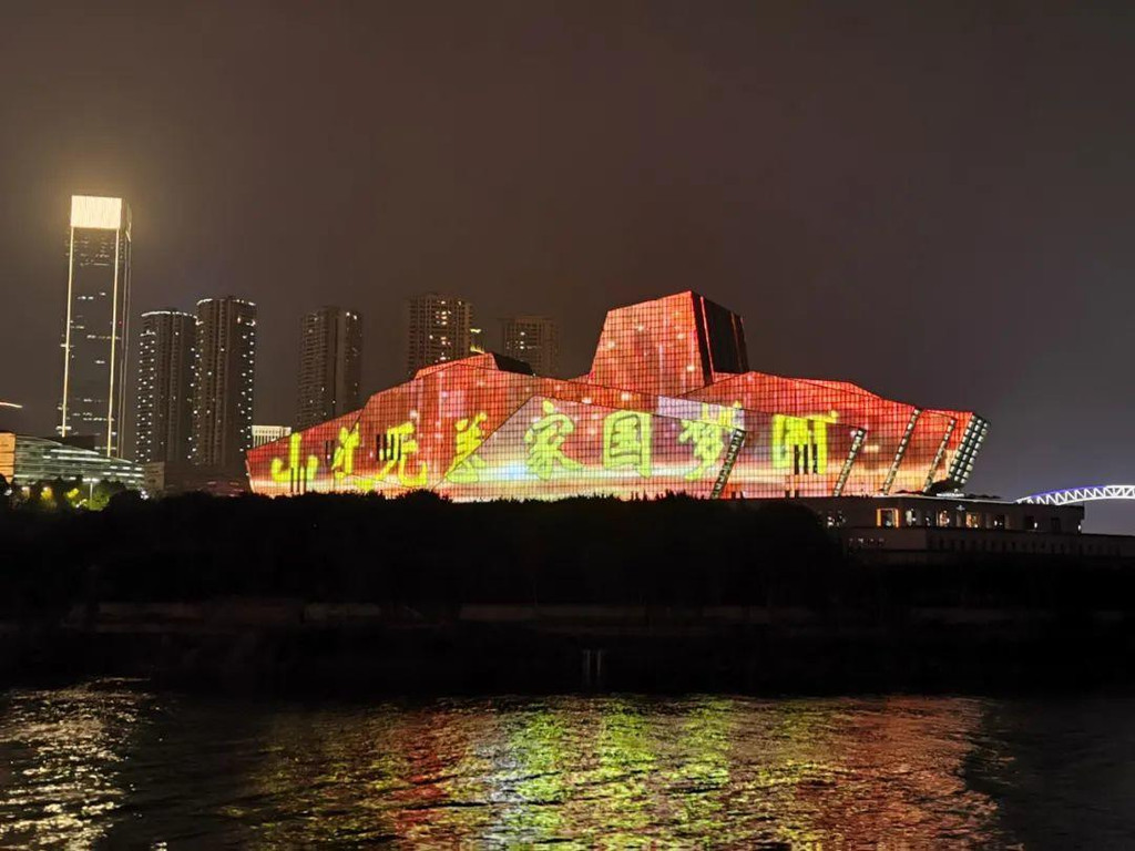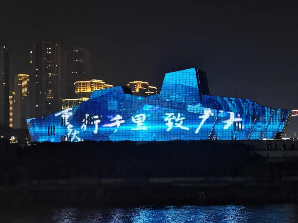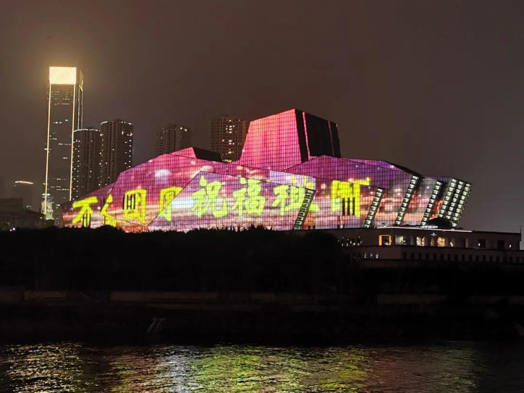 游船远方的岸边,如翡翠一般的建筑是重庆大剧院,造型新颖的玻璃幕墙不断变换颜色和文字,表达着进取和祝福。