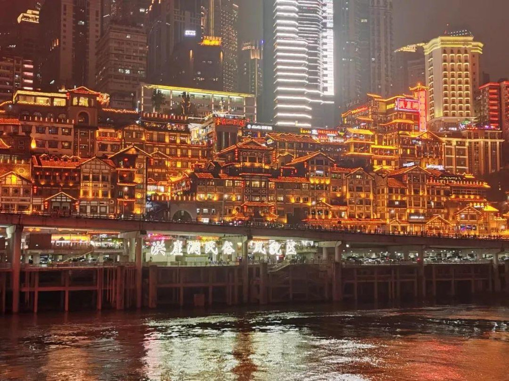 夜游进入尾声时来到了洪崖洞,在江面上可以看到洪崖洞的全貌,高低错落,灯火通明,宛如《千与千寻》中充满魔力的汤屋。