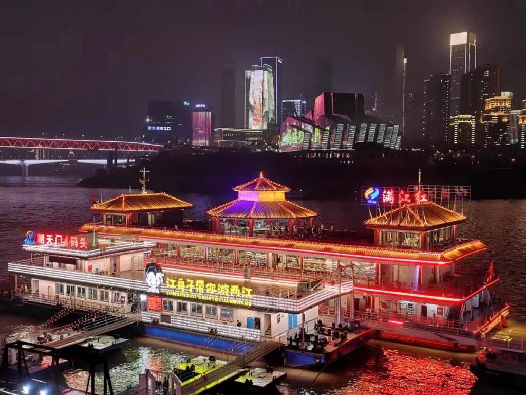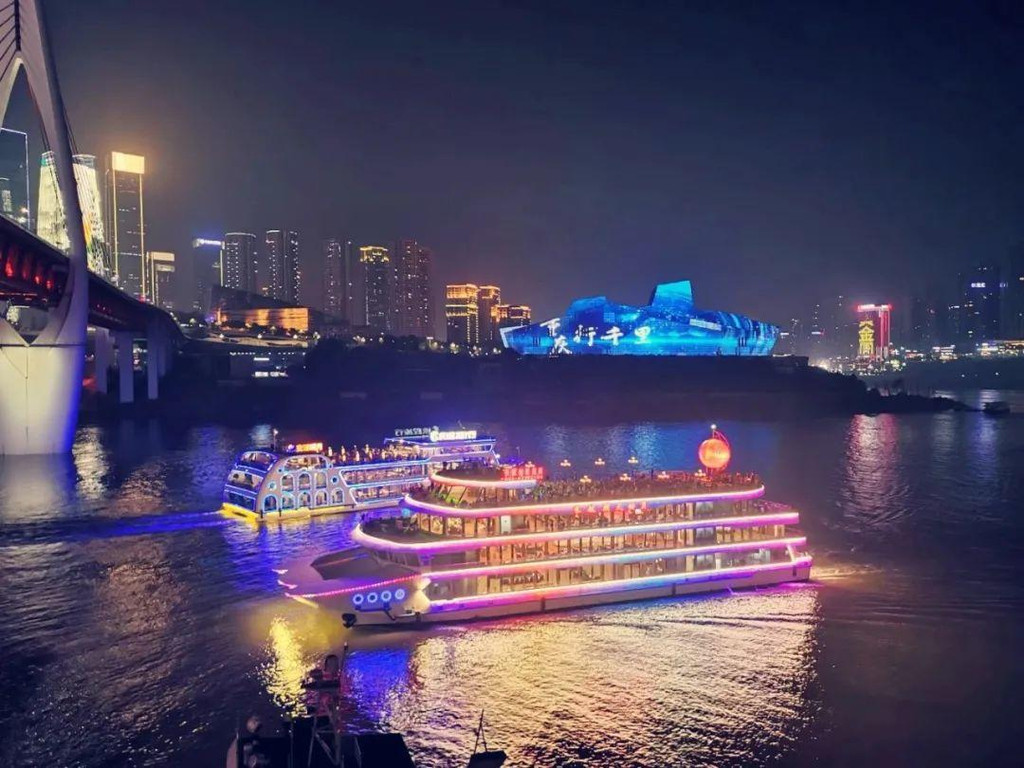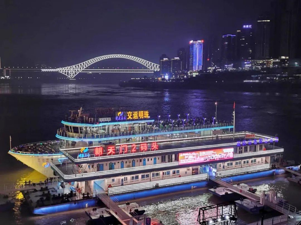 看山城夜景有两种方式备受推崇,一是坐过江索道越过长江,然后登上南山一棵树观景台,从高空和对岸俯瞰远眺山城五彩斑斓的迷人夜色;还有一种就是乘坐游船,从嘉陵江和长江交汇处的朝天门码头出发,溯长江而上,后折返至嘉陵江,一路经过东水门长江大桥、湖广会馆、慈云寺、重庆大剧院、千厮门嘉陵江大桥、南滨路、洪崖洞等胜景,最后返回朝天门码头,全方位、多角度、近距离地欣赏重庆的繁华夜景。