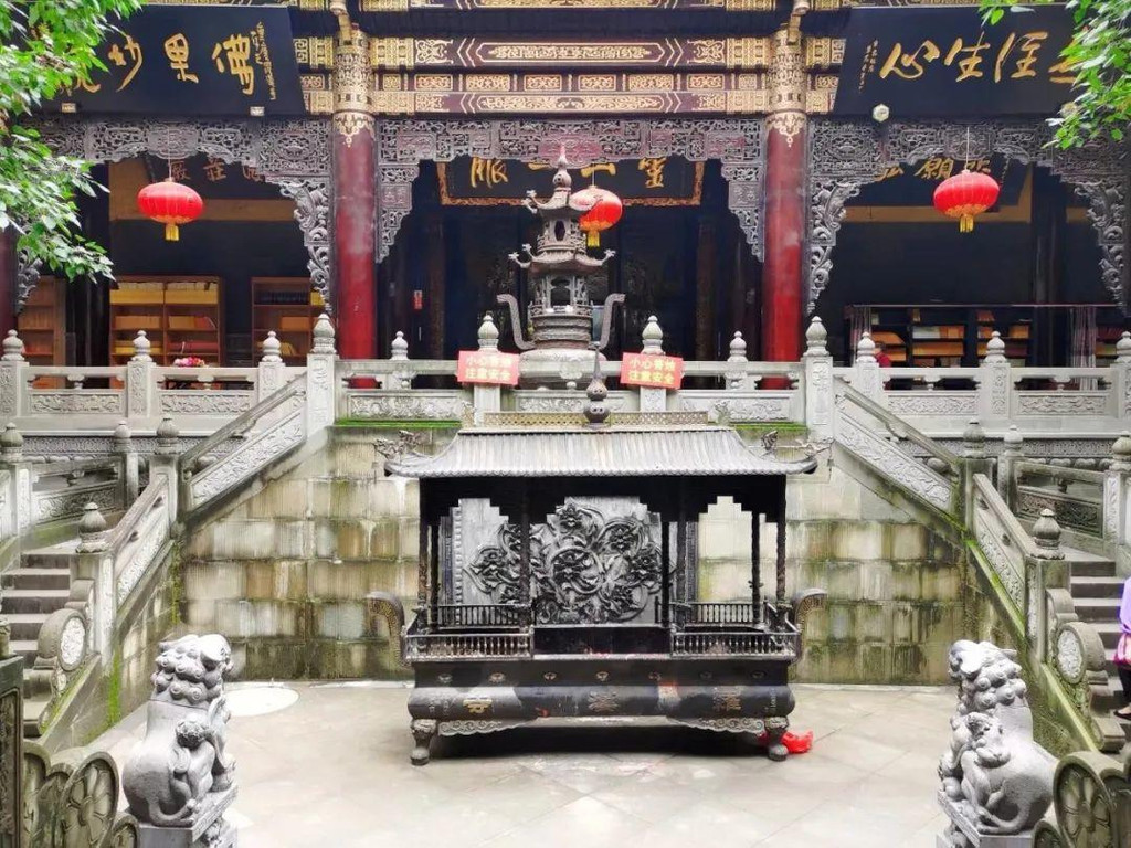 整座寺庙楼阁重叠,殿堂深邃,屋脊高耸,飞檐凌空,衬以参天古柏,高大竹树,显得十分雄伟庄严。