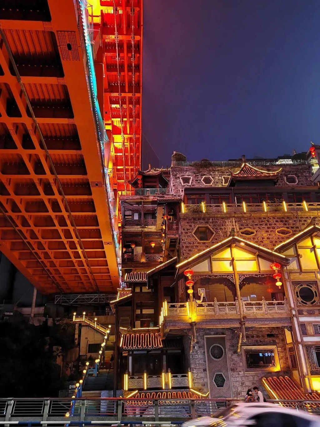 (洪崖滴翠的木桥上可以从侧面欣赏洪崖洞的吊脚楼)