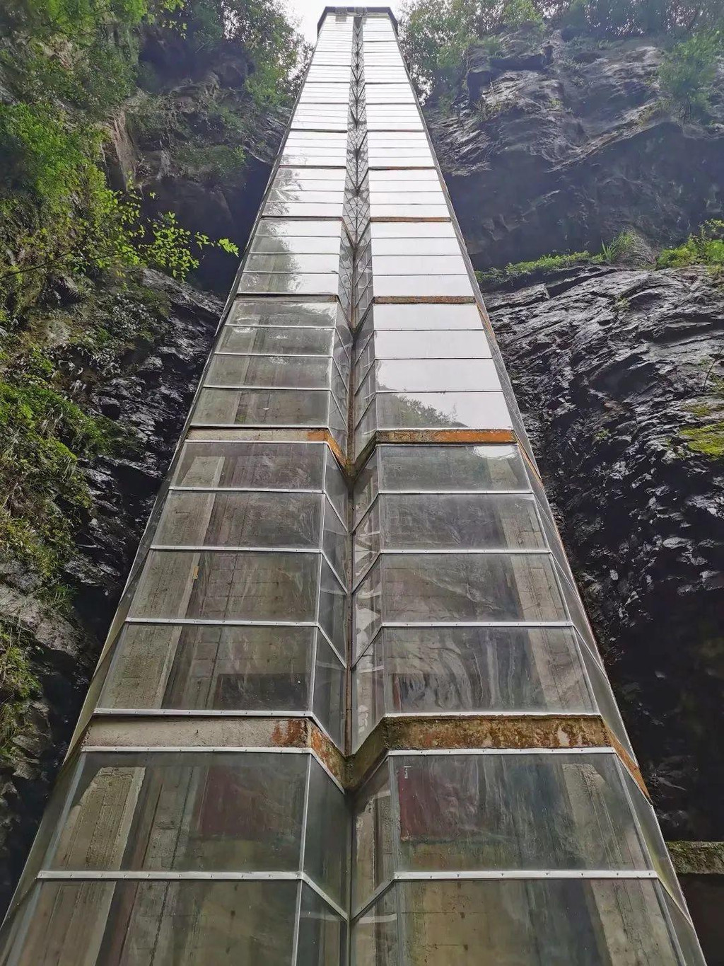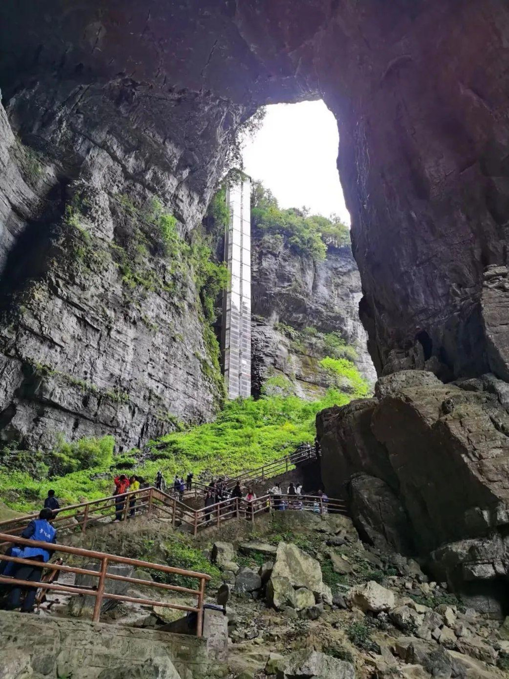 从入口下至天坑的电梯也是一大景观,垂直紧贴崖壁,巍峨壮观。
