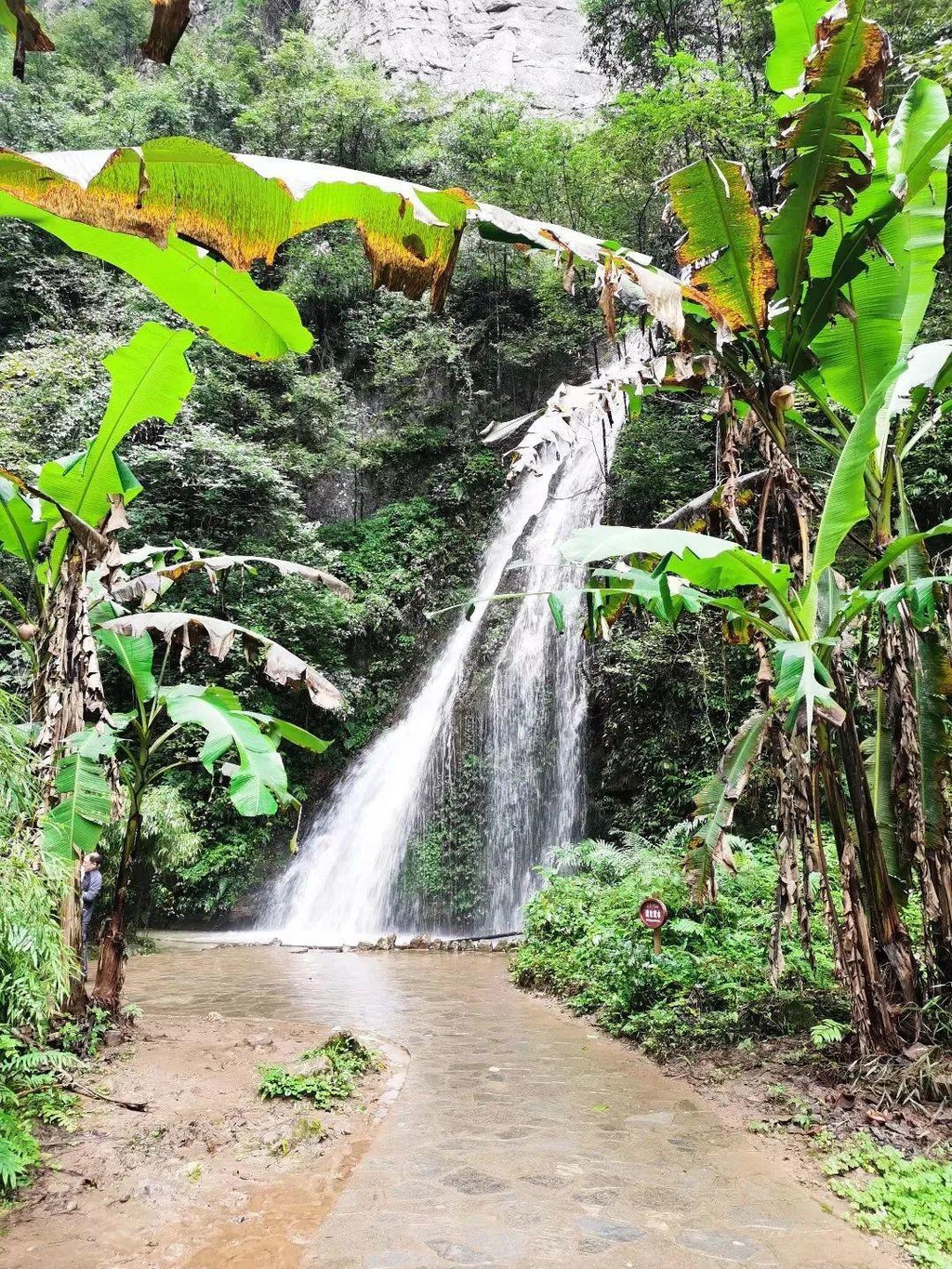 这座壮阔的瀑布名为“银河飞瀑”,此瀑从峡谷右壁山洞中涌出,沿坡壁冲蚀形成了几处大小不等的深潭,从上至下形成四层阶梯状跌水,最下一级高差达80米。巨量的水流终年不断,撞击在左壁坚硬的岩石上,冲蚀出一个巨大凹坑,溅起许多水花,这个过程产生了大量负氧离子,深吸一口,顿感神清气爽,因此这里要被称作“天然氧吧”。