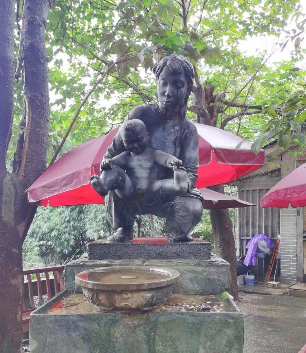 “少妇尿童”雕塑位于离宝轮寺不远的磁器口横街上。关于雕塑也有一个传说:落难的建文帝因奔波劳累,患上了哮喘、劳损、风湿等病,碍于永乐皇帝追杀而不敢求医问药,某天夜里,神仙托梦于他,说“七岁童男小便可解也”,第二天出庙暗访,果然发现一女人抱一男童小解,问之,童正七岁,便说明来意讨要童尿,一碗童子尿饮下,病痛俱去之,这就是“护龙水”的故事。