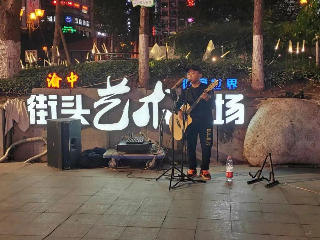 街头艺术家动情吟唱,用流动的歌声装点夜色: