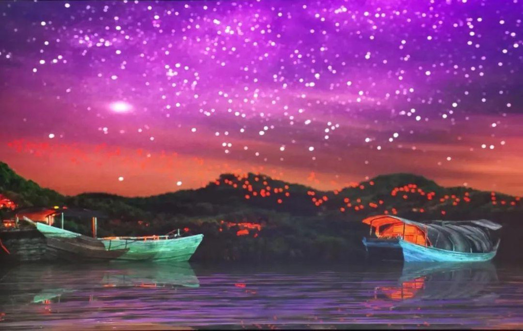 江水悠悠,江风瑟瑟,皎月昭昭,云影绰绰,两岸通明的灯火和夜空璀璨的星月倒影水中,犹如畅游星河。