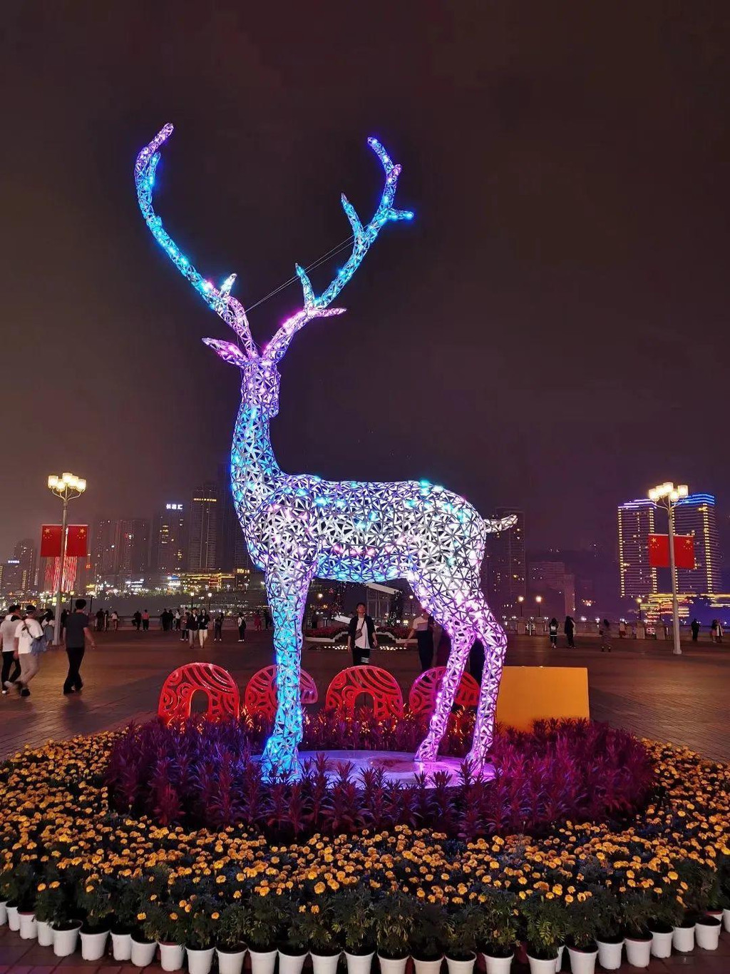 沿江而行,两岸是层层叠叠的灯光,万家灯火和闪烁霓虹将夜色点缀得梦幻又璀璨,不同的地方江水呈现不同的颜色,鲜红的大桥下是平静的“红海”,深蓝的游船处是起伏的蓝波,五彩的灯光在水中荡漾律动,在静谧深沉的夜空下晕染出一条变色的彩带。