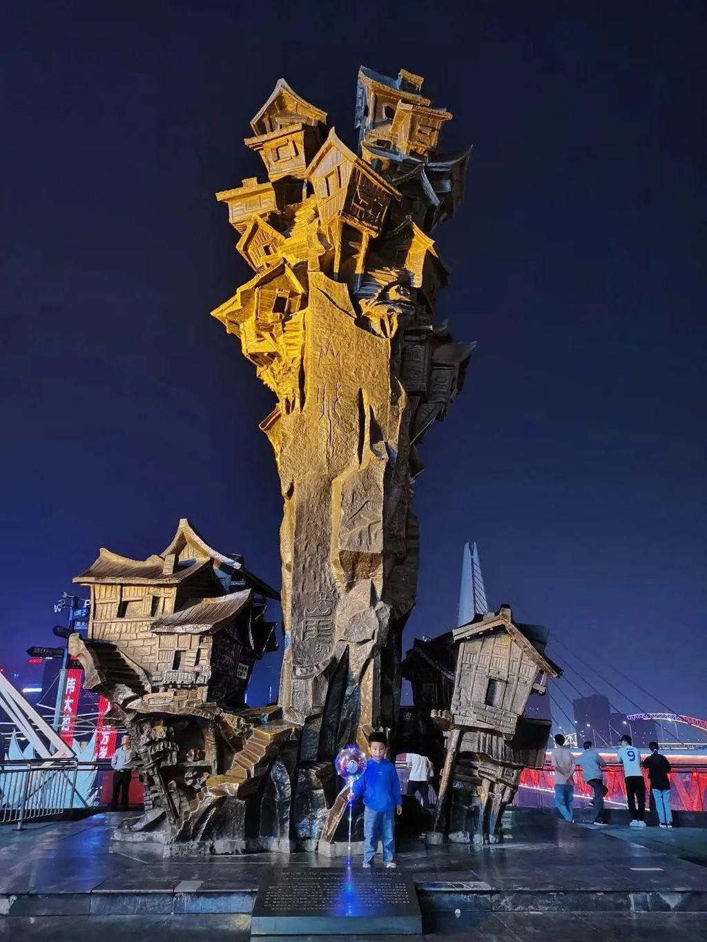 下面这座雕塑立在洪崖洞顶层,高达13.8米,由青山、石梯、悬崖、老巷和20多幢吊脚楼错落融合在一起,名为《记忆山城》,它别具一格地将一座历史悠久的山城的市井小巷和特色景观生动地展现了出来。