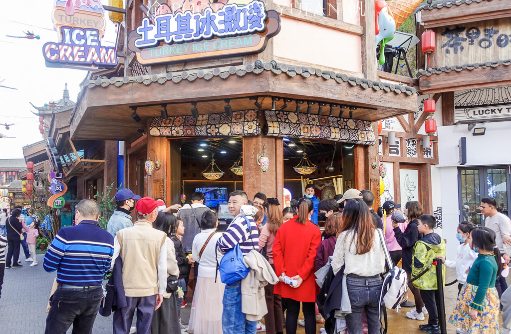 小镇不用门票,玩项目单独买票,如果不玩游乐项目,还有很多美食可以打卡,因为人多,所以这些美食门店前基本都排着长龙,看起来生意都很不错。
