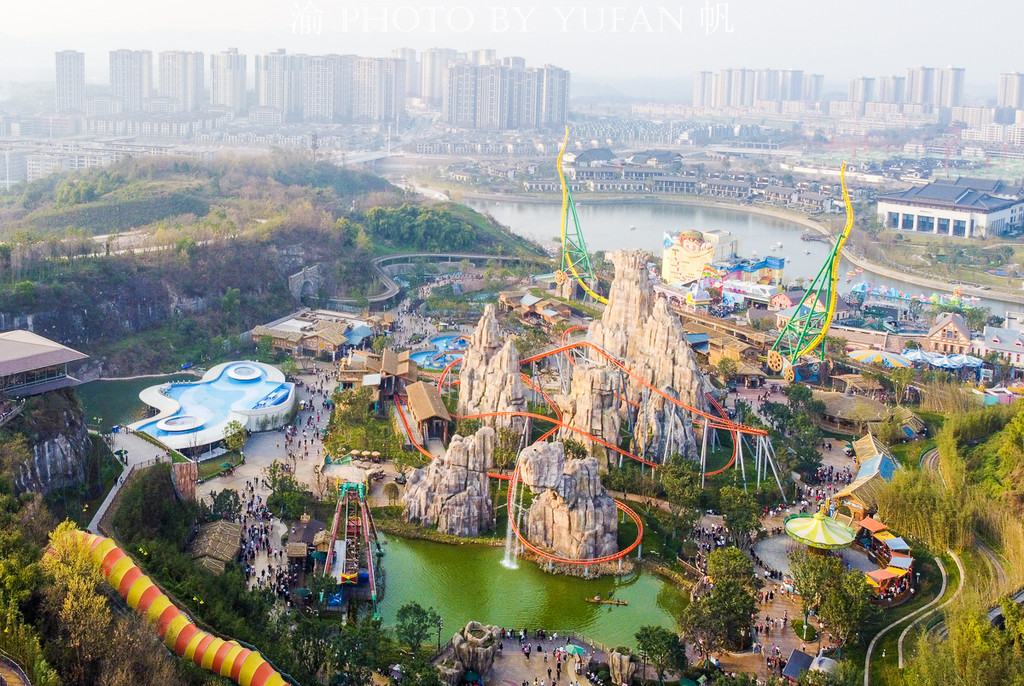空中俯瞰渝乐小镇,最远处是非常刺激的传奇双龙——U型双螺旋过山车,中间则是大型的矿山飞车,同样让很多人望而却步,极具挑战,另外还有前面提到的竹林飞车、海盗船等。