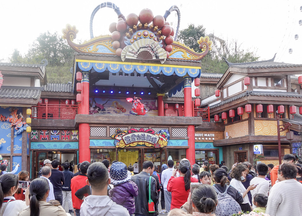 如果我没有记错的话,这个项目叫竹林飞车,可以看到空中飞旋的坐椅坐无虚席,下面的观众虽然没有拍出来,但也可以隐约看到大量的观众与排队人群,热闹程度可想而知。