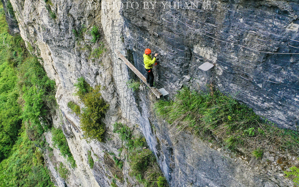 第三站:勇敢者的游戏——金佛山飞拉达飞拉达是意大利文Via Ferrata的音译,意为岩壁探险或铁道式攀登,是由铁扶手横梯、固定缆索、岩石塞、踏脚垫等构成的爬山径道。是一项有趣的户外运动,据说在欧洲已流行了上百年,起源于第一次世界大战时期,当时意大利为让其军队能快速地抄山路,攀越多洛米堤山,于是在山体上建立了这种可错士兵攀爬的山体铁环。