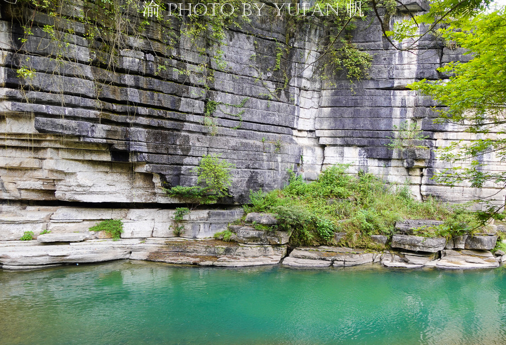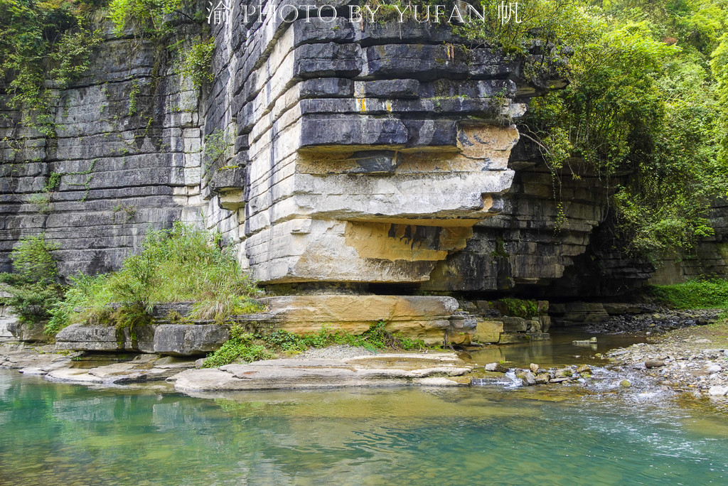 第八站:百年古渡口——庞官渡庞官渡位于庆元镇,所在的位置有一条曲折蜿蜒的河流,对岸则是一片绝壁,壁石非常特别,一层一层,线条笔直,如万卷经书一般;渝帆问过当地的朋友,这属于什么地质特征?他们只表示金佛山属于南方喀斯特地貌,至于这种一层一层的岩石结构属于什么地质,他们也不清楚,大家都觉得很神奇,如同上帝建在河畔的城墙一般。