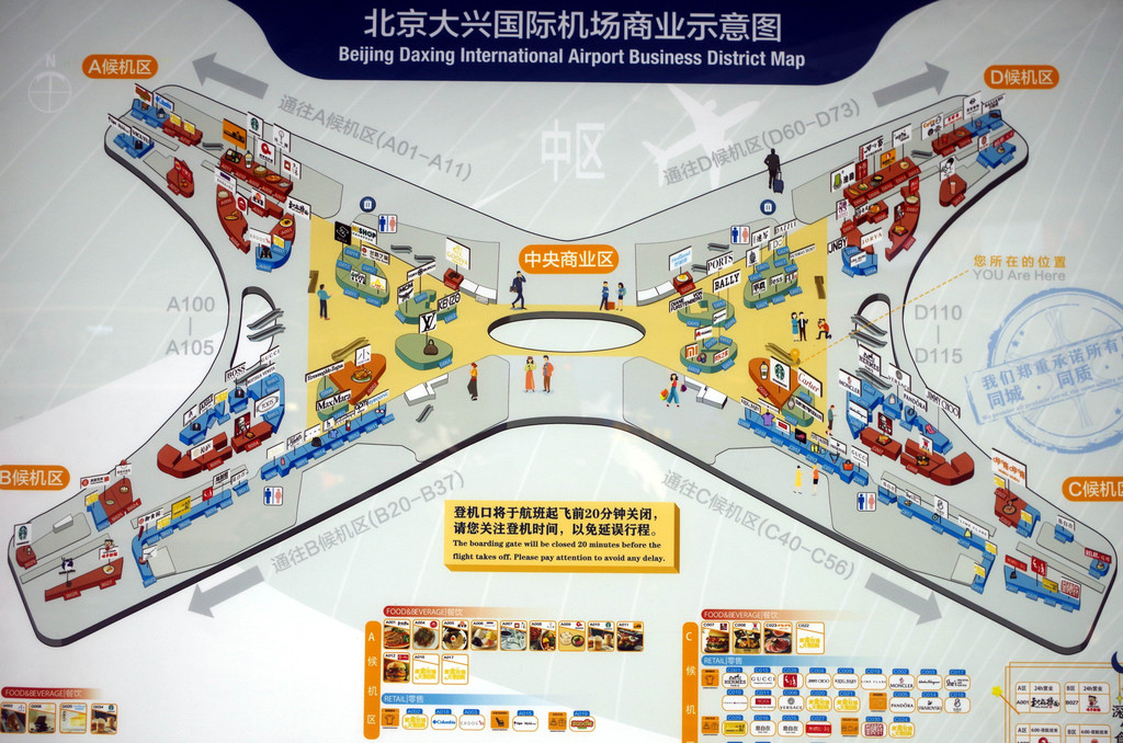 走进内部看,她好像是个大x型,伸出的四个臂,四面都可以停靠飞机。相当于八个航站楼了。记得2019年去美国,在洛杉矶机杨,我就是在第八航站楼上的飞机飞的夏威夷。当时觉得,洛杉矶的机场真是大呀。可是,它的设计,只是单体的八个建筑。而大兴的机场航站楼,却是世界上第一个单体多面的航站楼。